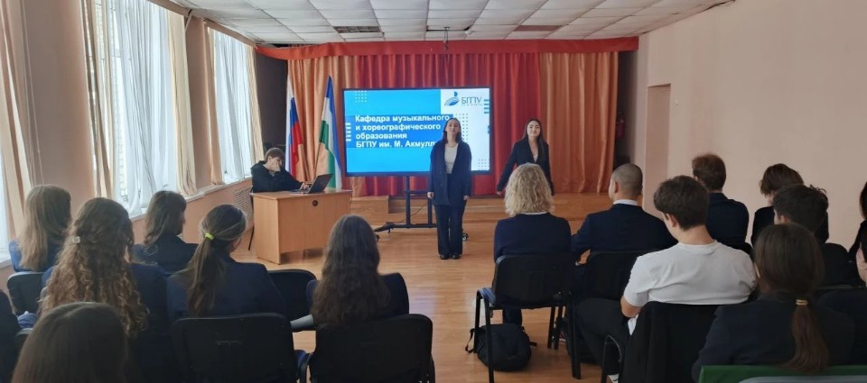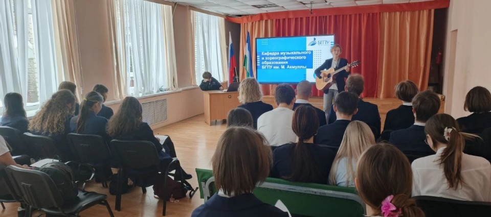 Школьники 10-го класса прослушали информацию о БГПУ им. М.Акмуллы, исполнение студентами музыкальных произведений в разных стилевых направлениях музыки (рок, джаз, авторская песня), связанные  новым направлением подготовки «Дополнительное музыкальное образование в сфере эстрадного искусства», а также спели вместе с  ребятами популярную песню, заполняли анкеты будущих абитуриентов. Приятно, что участникам от кафедры МХО оказали теплый прием и поддержку в мероприятии выпускники кафедры МХО предыдущих лет: советник директора Гарипова Айгиза Рифкатовна, учителя музыки Гильметдинов Камиль Шамилевич, а также  Гайсина Юлия Рафаиловна.
