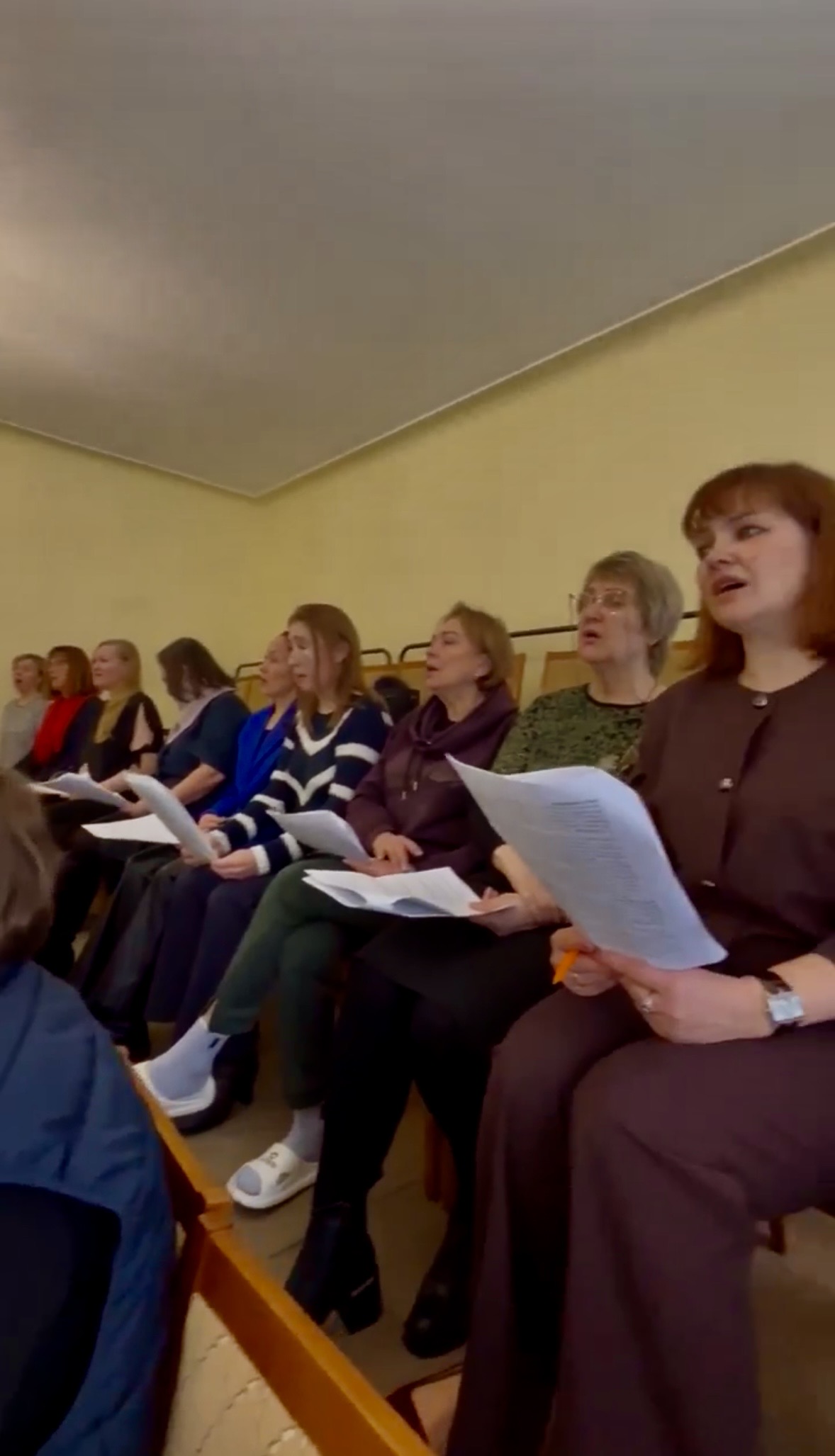 Хор разучивает народную песню «По речушке утенушка плавала», но в современной джазовой отработке.