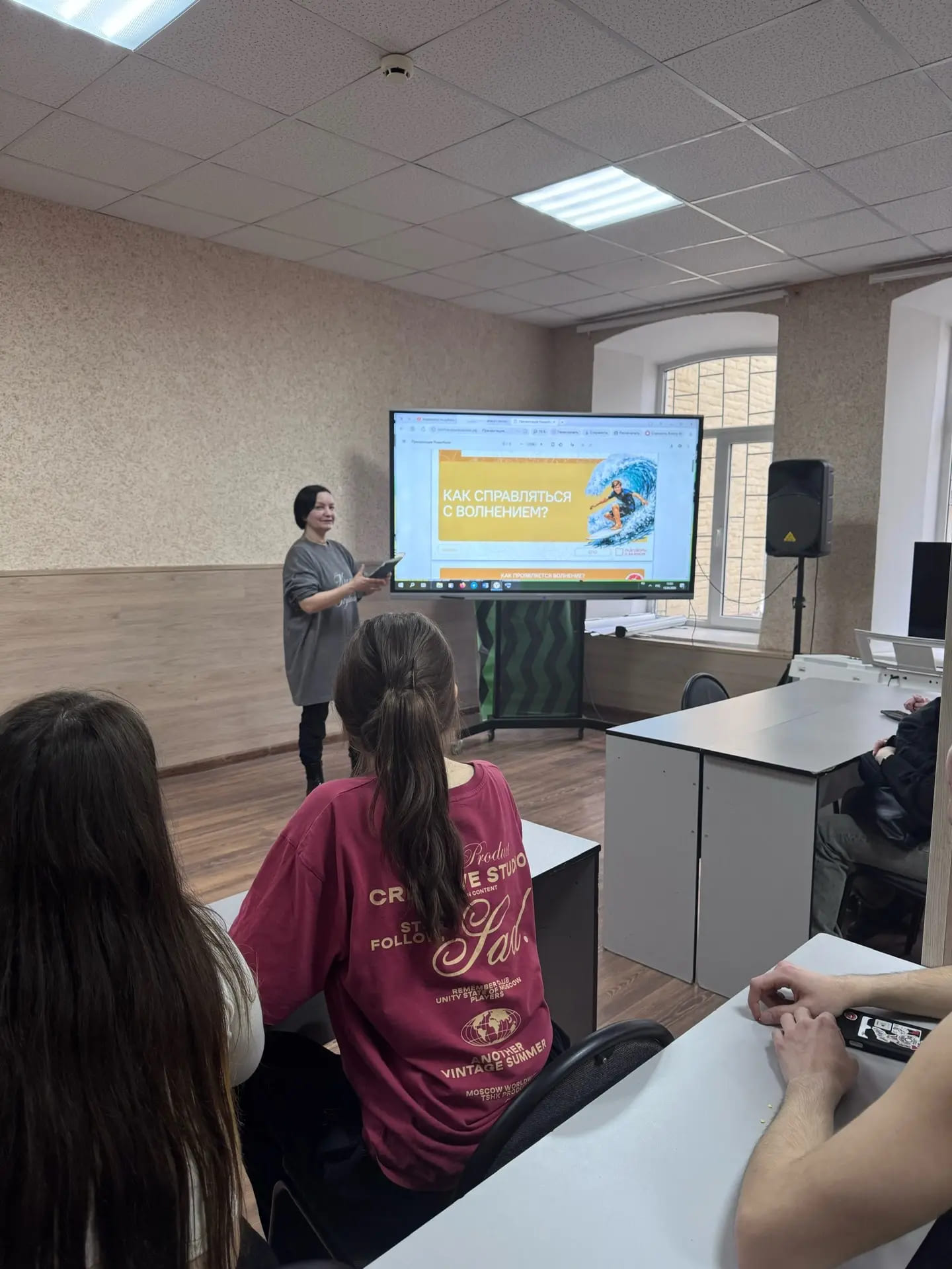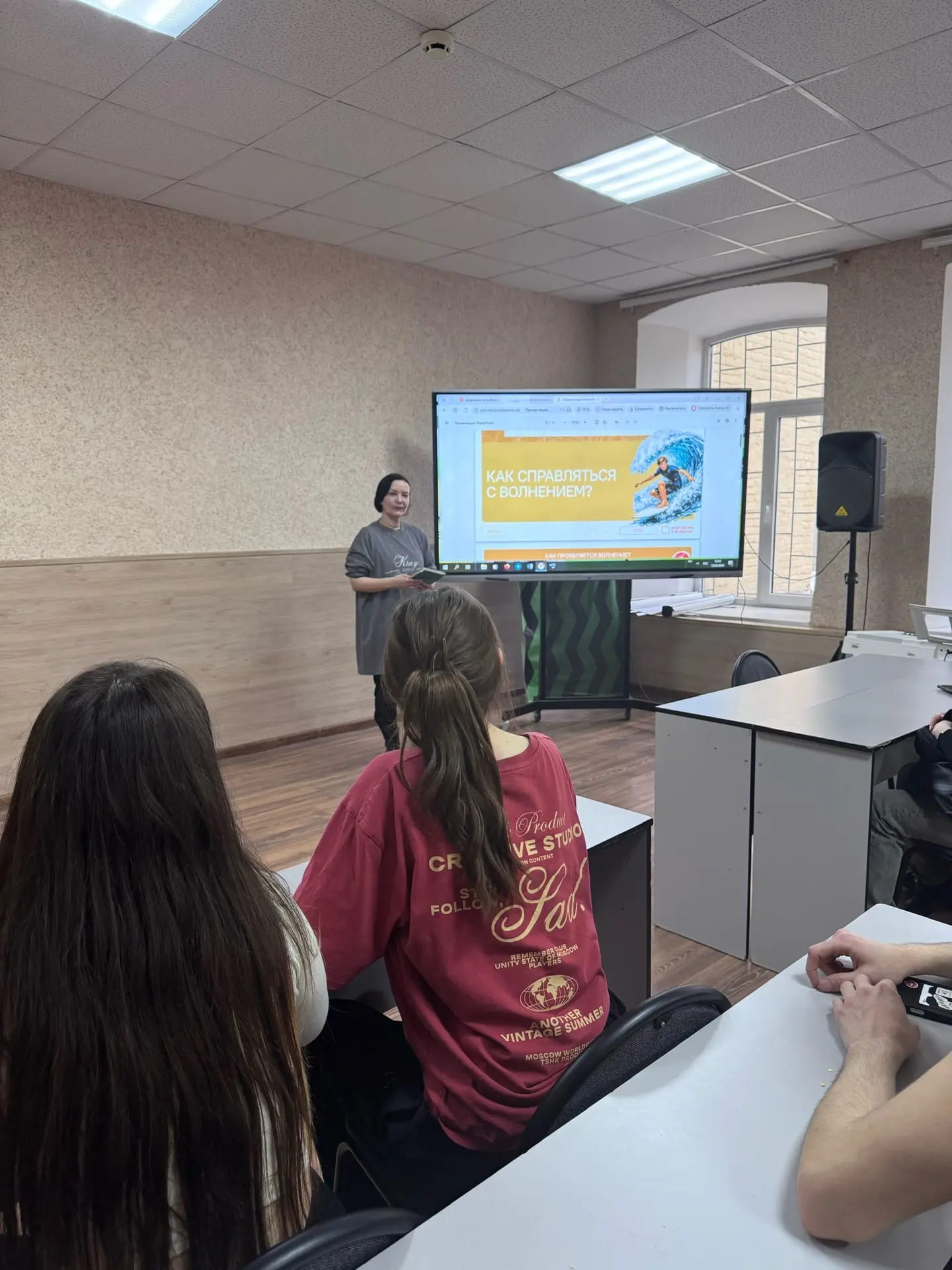 Преподаватель и студенты поговорили о том, что мы ощущаем, когда волнуемся, о причинах волнения и как с ним справляться.  Разобрали волнение на физическом телесном и психическом уровне и  техники саморегуляции при волнении.