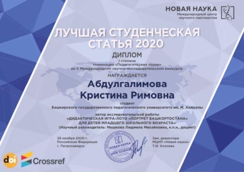 Абдулгалимова Кристина, студентка 2 курса Института педагогики (направление «Начальное образование»), стала победителем II Международного научно-исследовательского конкурса «Лучшая студенческая статья 2020».