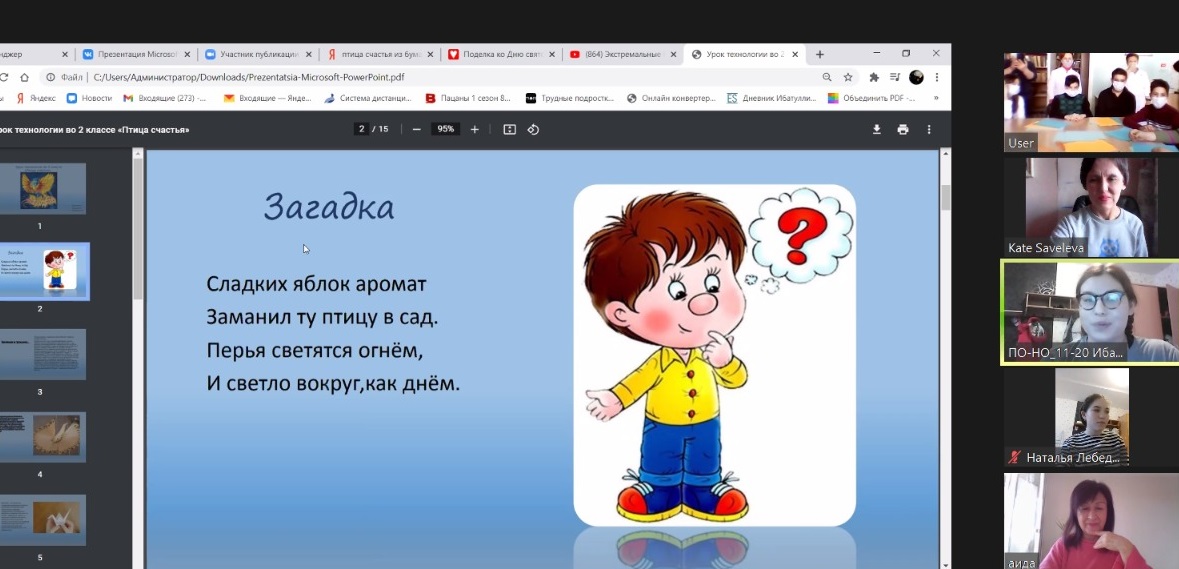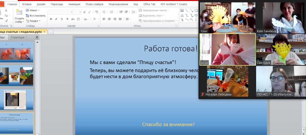 21 февраля 2021 года для маленьких пациентов Республиканской клинической психиатрической больницы волонтеры отряда «Палитра», студенты 1 курса направления «Начальное образование» БГПУ им. М. Акмуллы Диана Ибатуллина и Наталья Лебедева совместно с «серебряными» волонтерами Башкортостана: доц. кафедры ТиМНО, руководителем студенческого волонтерского отряда «Палитра» ИП БГПУ им. М. Акмуллы Екатериной Савельевой, заведующей сектором эстетического воспитания Центральной городской детской библиотеки им. Ш. Худайбердина Светланой Ермаковой и Аидой Рафиковой провели творческое занятие онлайн «Птица счастья». Волонтеры с помощью презентации познакомили участников мероприятия с историей появления птицы счастья, рассказали, что она приносит счастье, добро, здоровье и научили в технике оригами складывать поделку.