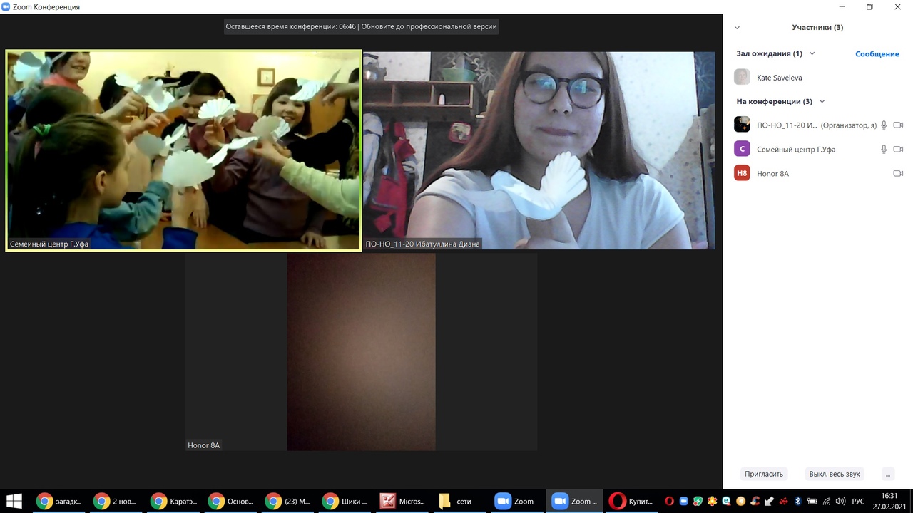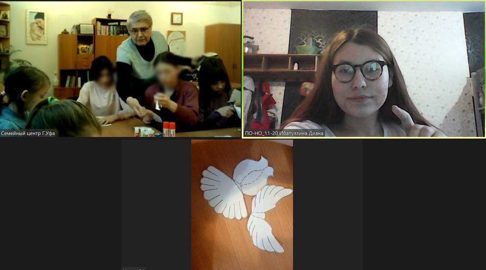 Подготовка к проведению игры «Живые картины» уже началась – студентка-волонтер отряда «Палитра» Диана Ибатуллина, под руководством «серебряного» волонтера Екатерины Савельевой, провела 27 февраля 2021 г. занятие-онлайн с воспитанниками семейного центра "Вместе" г. Уфы и из бумаги изготовила бумажных голубей мира. Большую помощь в проведении занятия оказала воспитатель Елена Васильевна Иванова.