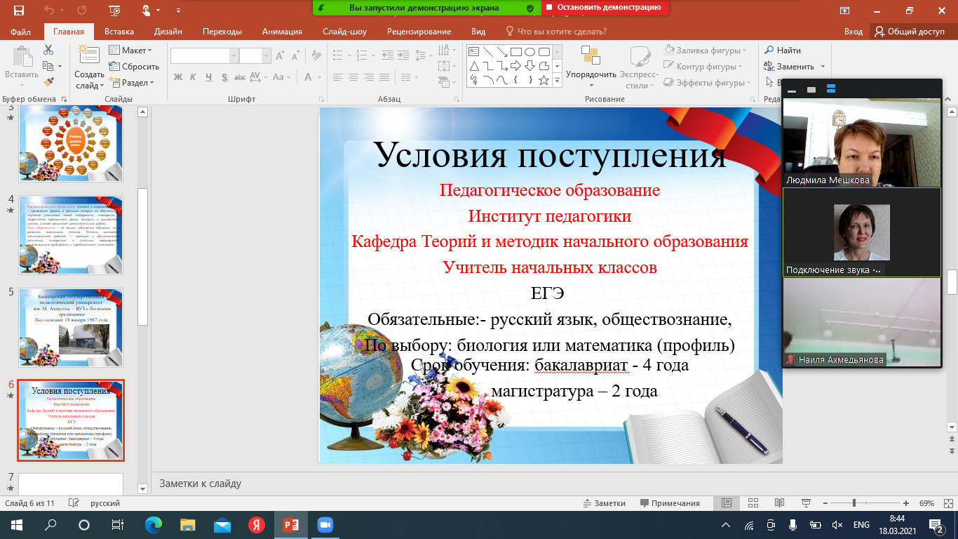 18.03.2021 года, в рамках профориентационной работы кафедры Теорий и методик начального образования Института педагогики, были проведены мастер-классы к.п.н., доцентом Мешковой Л.М. «Как стать учителем начальных классов» с учащимися МОБУ СОШ с. Миловка Уфимского р-на РБ и учащимися МАОУ СОШ №8 г. Туймазы РБ. Обучающиеся узнали о престижности профессии учителя начальных классов, познакомились с направлениями подготовки педвуза в целом, с направлениями подготовки кафедры ТиМНО ИП БГПУ им. М. Акмуллы, выяснили, какие экзамены необходимо сдать для поступления в вуз на данное направление.