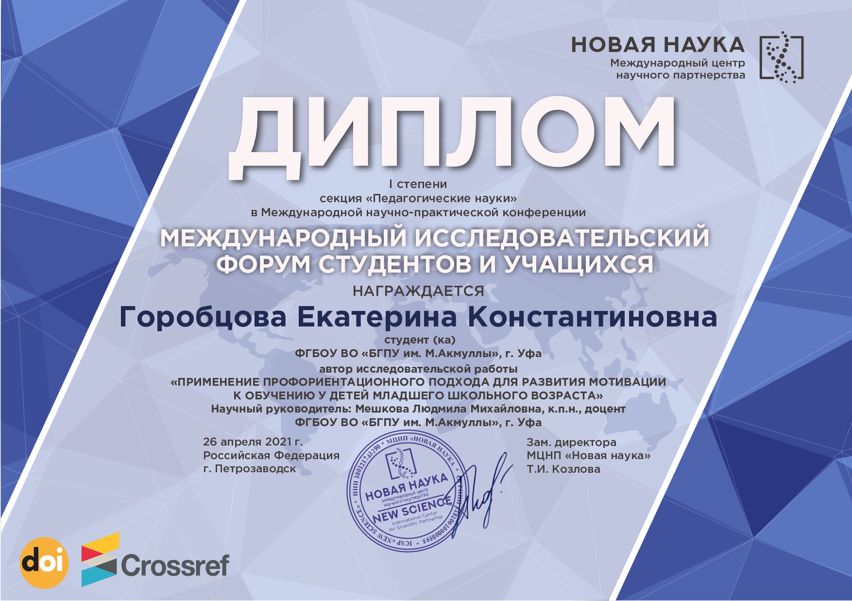 26 апреля 2021 г. состоялось подведение итогов Международного исследовательского форума студентов и учащихся (г. Петрозаводск). В данном форуме свои силы опробовала студентка 4 курса Института Педагогики направления «Начальное образование» Горобцова Екатерина. Ее статья «Применение профориентационного подхода для развития мотивации к обучению у детей младшего школьного возраста» была по достоинству оценена. По результатам форума Екатерина получила диплом 1 степени в секции «Педагогические науки» (научный руководитель – к.п.н., доцент кафедры теорий и методик начального образования Мешкова Л.М.). Поздравляем!
