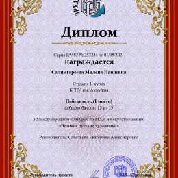 Студентка 2 курса направления "Начальное образование" Салимгареева Милена приняла участие 1 мая 2021 года в Международном конкурсе по МХК и искусствознанию "Великие русские художники".   По итогам конкурса Милена награждена дипломом 1 степени (научный руководитель к.п.н., доцент кафедры теорий и методик начального образования Савельева Е.А.).