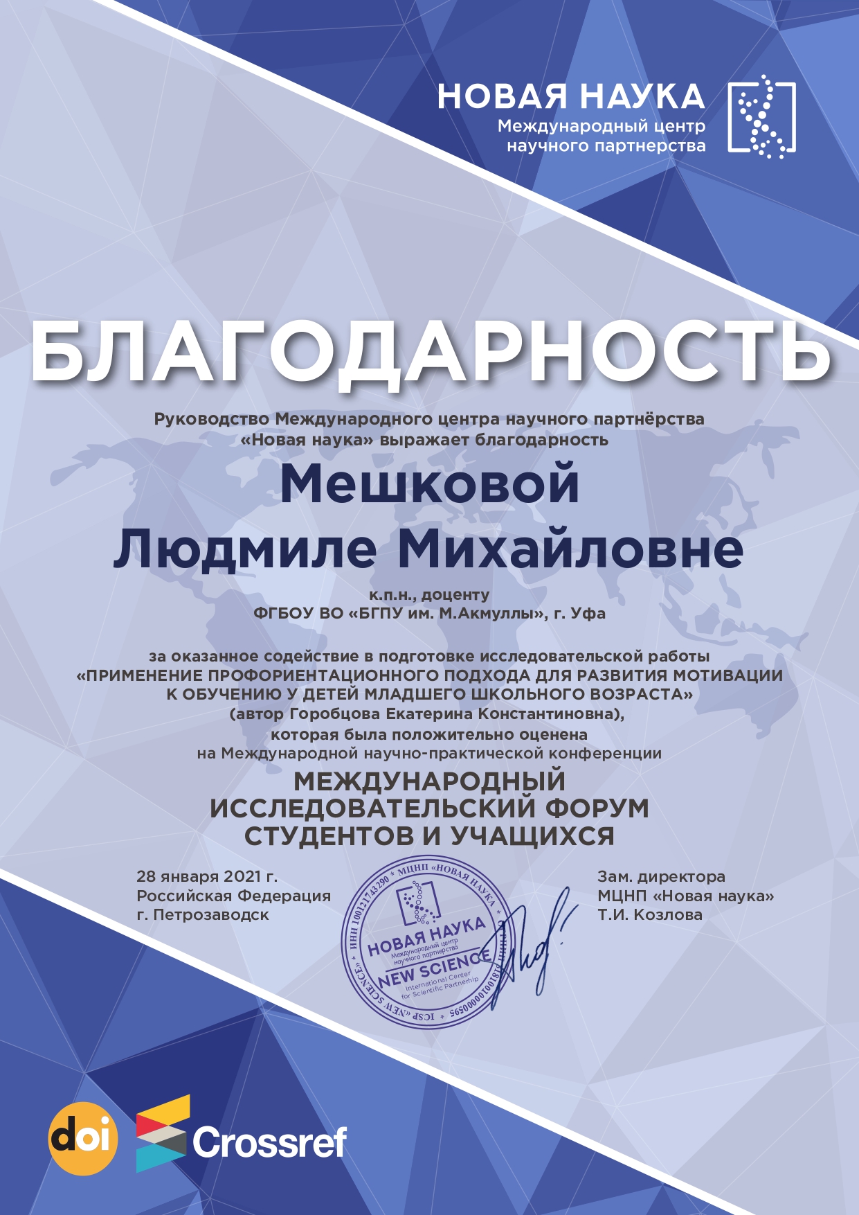 26 апреля 2021 г. состоялось подведение итогов Международного исследовательского форума студентов и учащихся (г. Петрозаводск). На нем свои силы опробовала студентка 4 курса Института Педагогики направления «Начальное образование» Горобцова Екатерина. Ее статья «Применение профориентационного подхода для развития мотивации к обучению у детей младшего школьного возраста» была по достоинству оценена. По результатам форума Екатерина получила диплом 1 степени в секции «Педагогические науки» (научный руководитель – к.п.н., доцент кафедры теорий и методик начального образования Мешкова Л.М.).