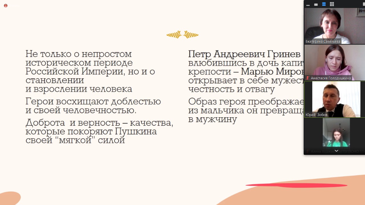 Первокурсники ИП БГПУ им. М. Акмуллы (студенты направлений «Дошкольное образование», «Начальное образование», «Специальное дефектологическое образование») посмотрели онлайн спектакль «Капитанская дочка» московского театра «У Никитских ворот». Постановку подготовил режиссёр Марк Розовский, музыку к ней написал Максим Дунаевский. Особенность спектакля в том, что сложные вокальные и танцевальные номера исполняют сами артисты театра, тогда как обычно приглашают вокалистов и танцоров. В пьесе все прозаические тексты в спектакле принадлежат Александру Пушкину, а тексты песен, которых в спектакле более 30, написал Марк Розовский.