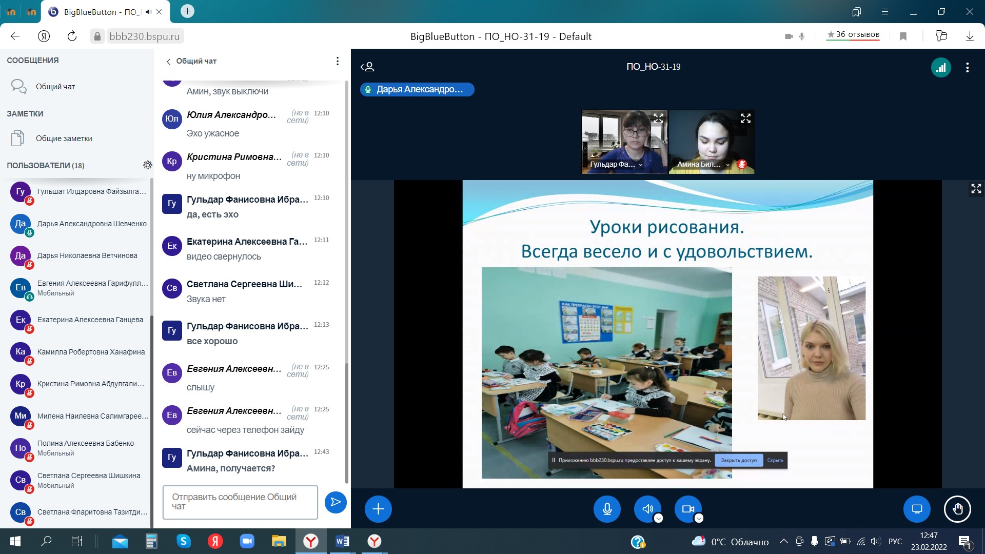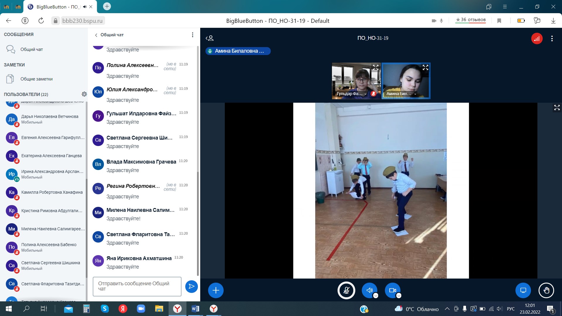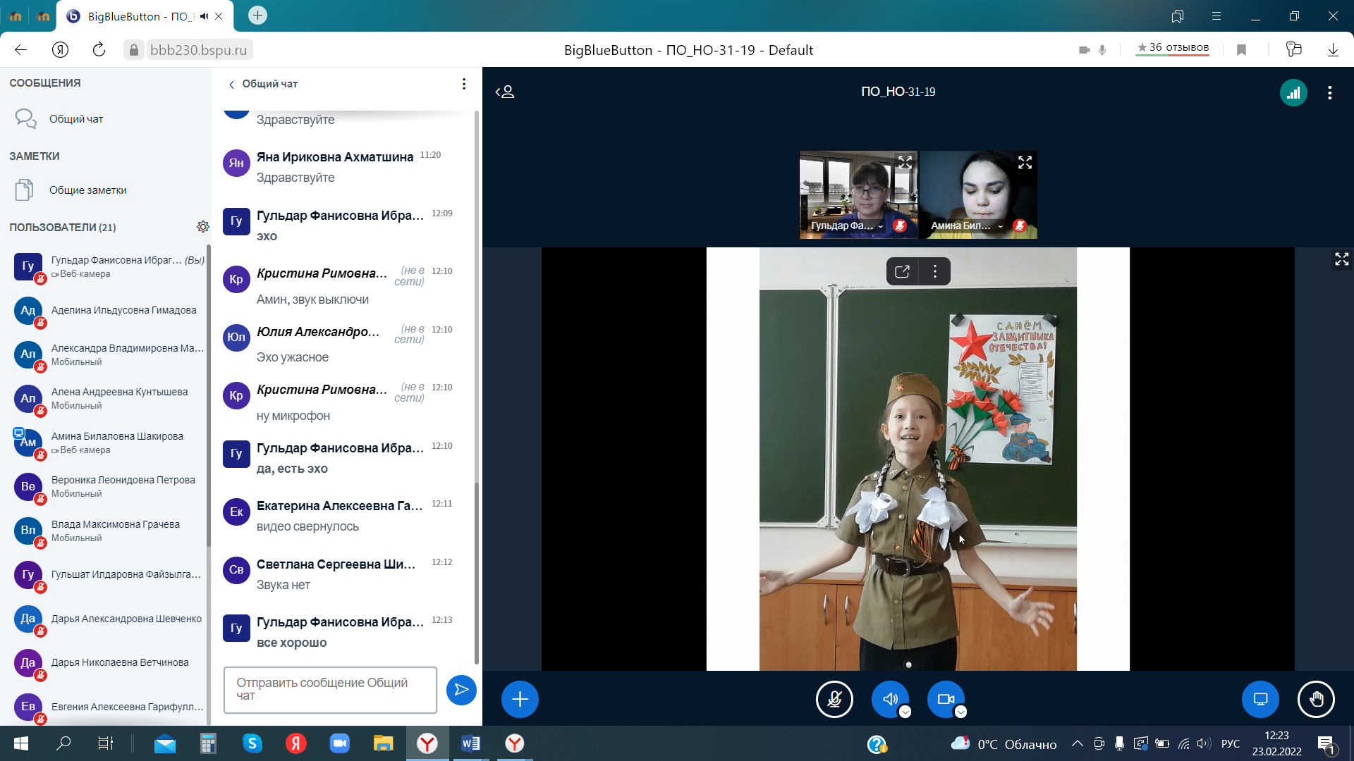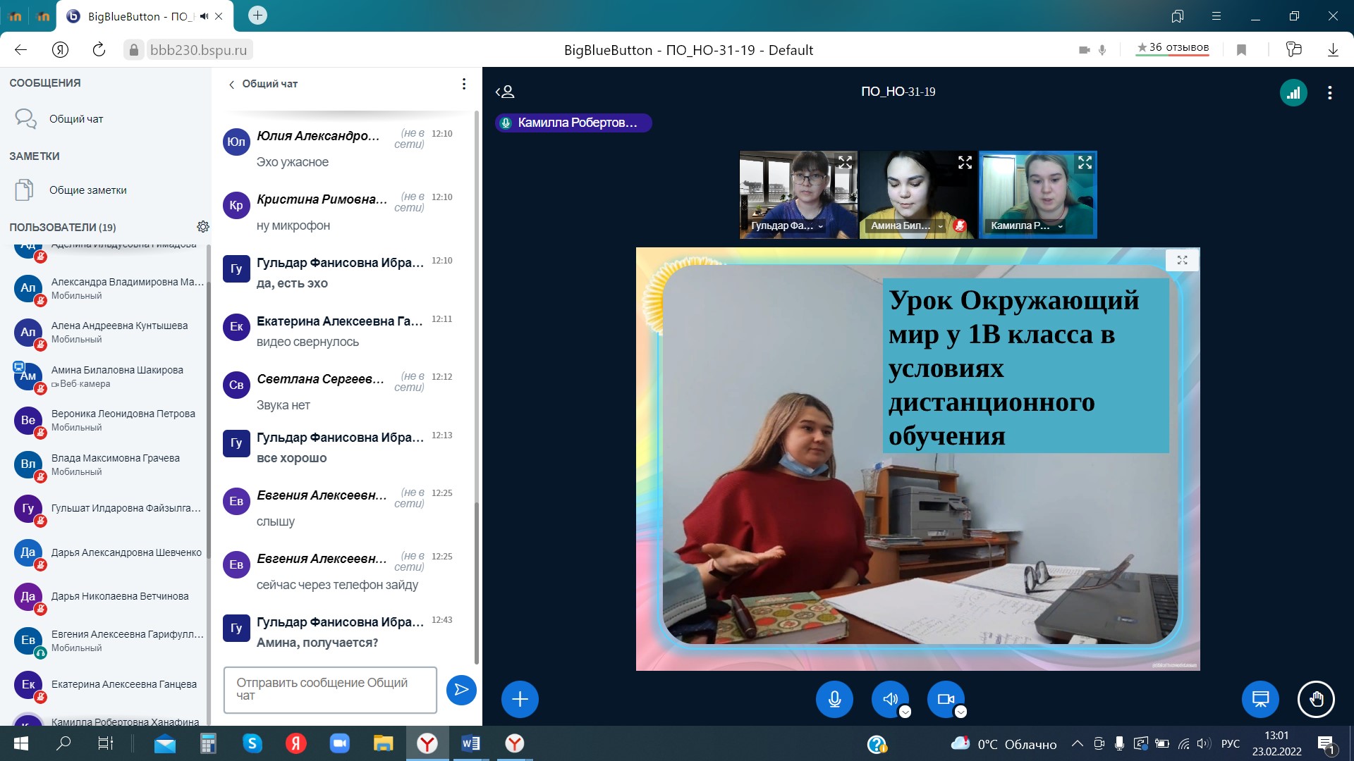 23 февраля 2022 г. прошла итоговая отчётная конференция по производственной педагогической (воспитательной) практике у студентов 3 курса направления 44.03.01 Педагогическое образование, профиль «Начальное образование» (руководитель практики – к.п.н., доц. кафедры ТиМНО Г.Ф. Ибрагимова). Согласно графику с 17.01.2022г по 22.02.2022г. студентами активно были пройдены дни практики: погружение в урочную и внеурочную деятельность, подготовка к школьным олимпиадам, участие в конкурсах, написание статьи по проблеме исследования, также анализ нормативно-правовой документации. Большинство студентов с удовольствием отзывались о пройденной практике, делились впечатлениями о своей подготовленности к будущей профессии.