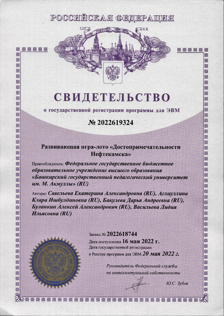 «Развивающая игра-лото «Достопримечательности Нефтекамска». Авторы: Савельева Е.А., Аглиуллина К.И., Бакулева Д. А., Буланкин А.А., Васильева Л.И.