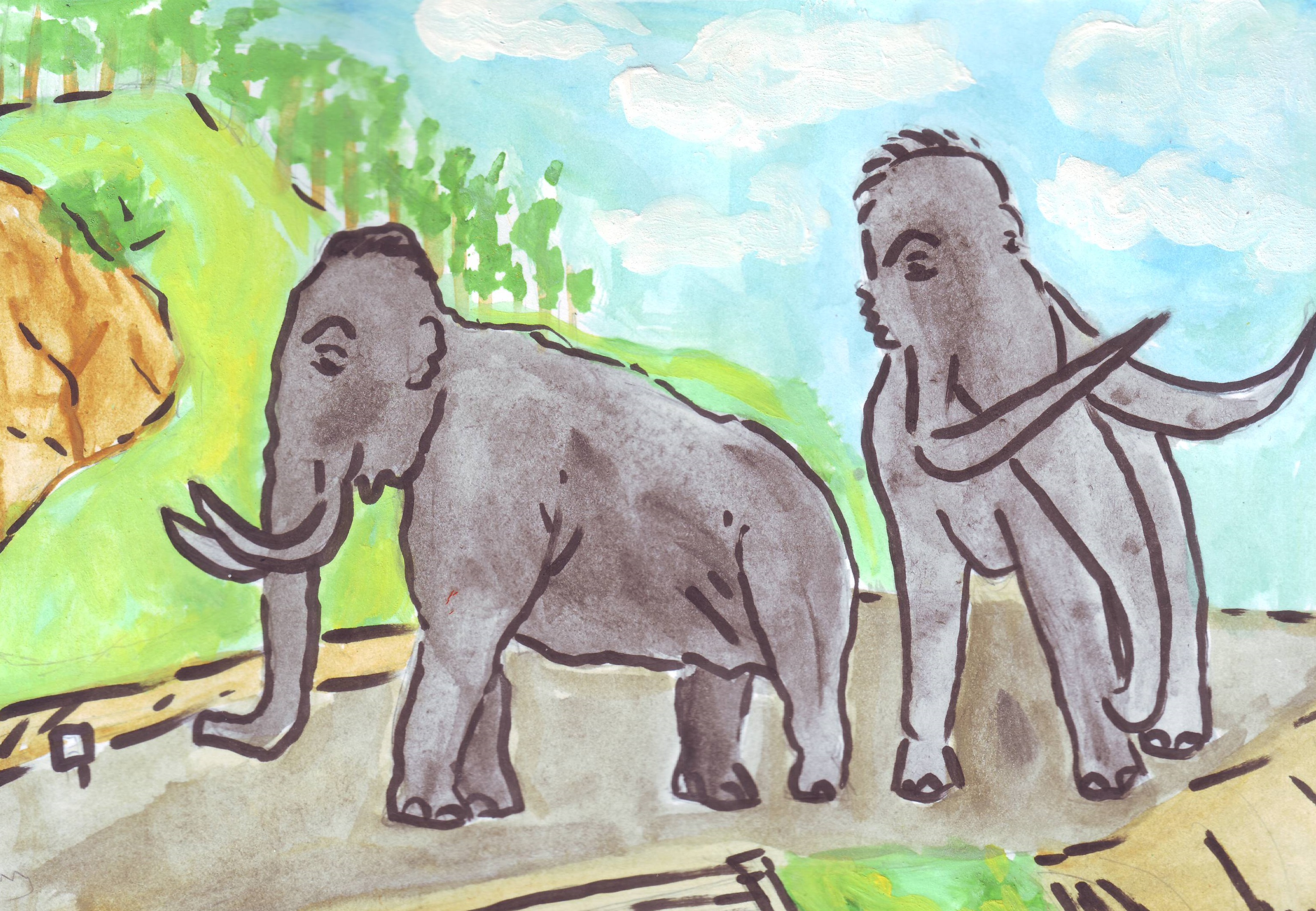 Аня К.: «Я очень люблю животных. Мне запомнились мамонты из «Археопарка, поэтому я их нарисовала».
