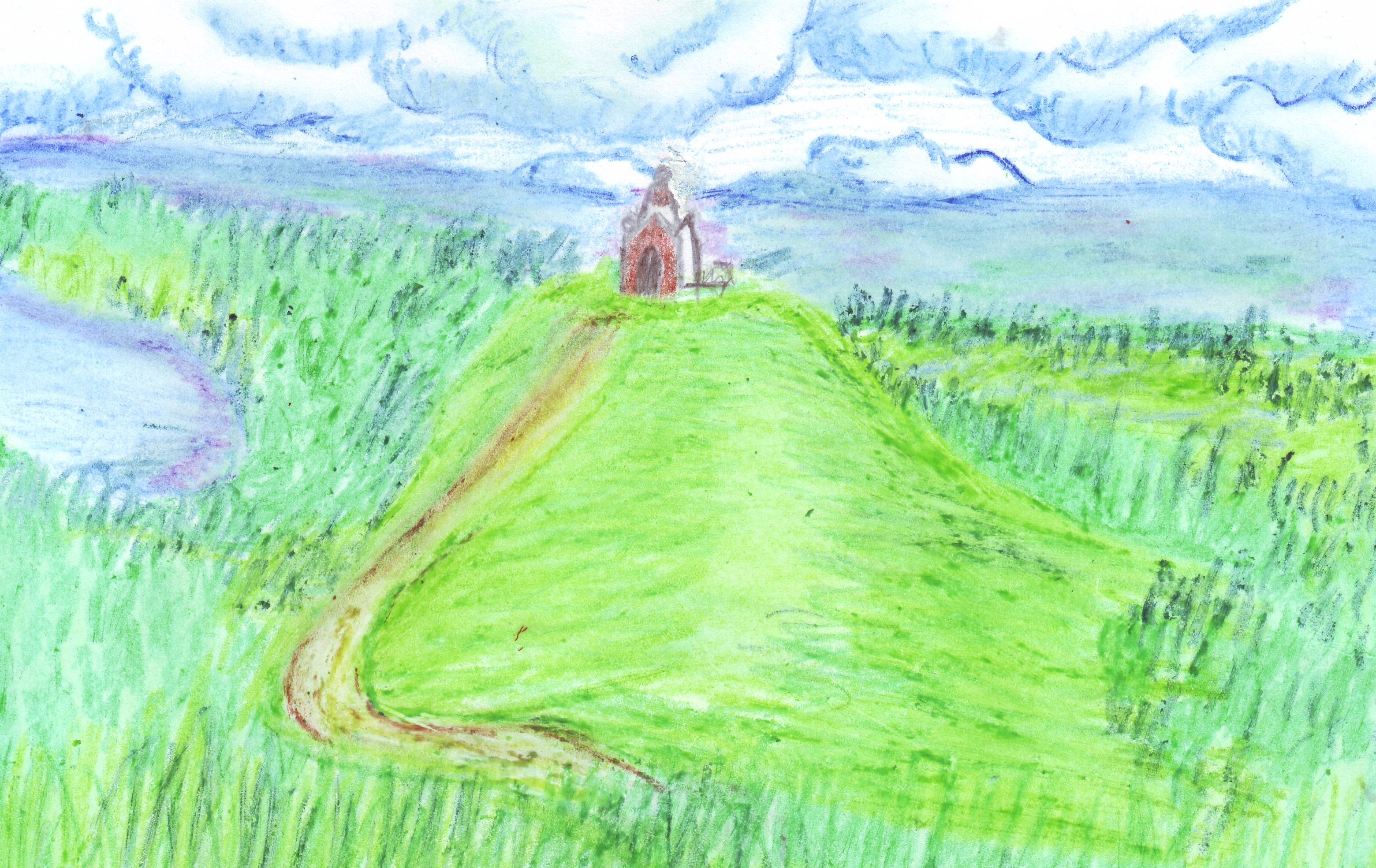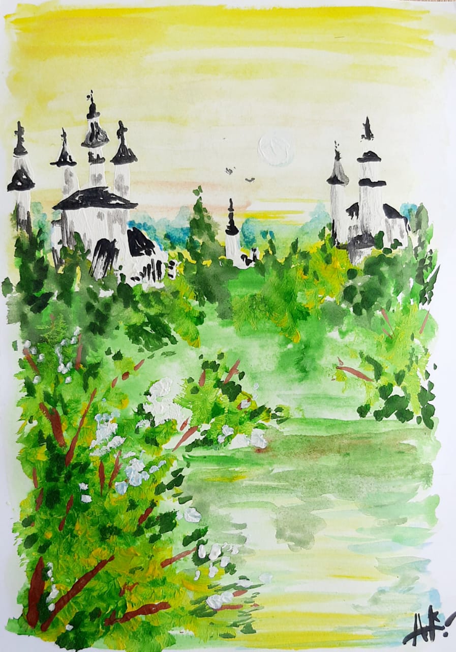 Мария В.: "Мне запомнился пейзаж Орловской области и вдалеке храмы. Я поэтому его нарисовала Хочется смотреть на этот пейзаж со своей второй половинкой и любоваться рассветом".