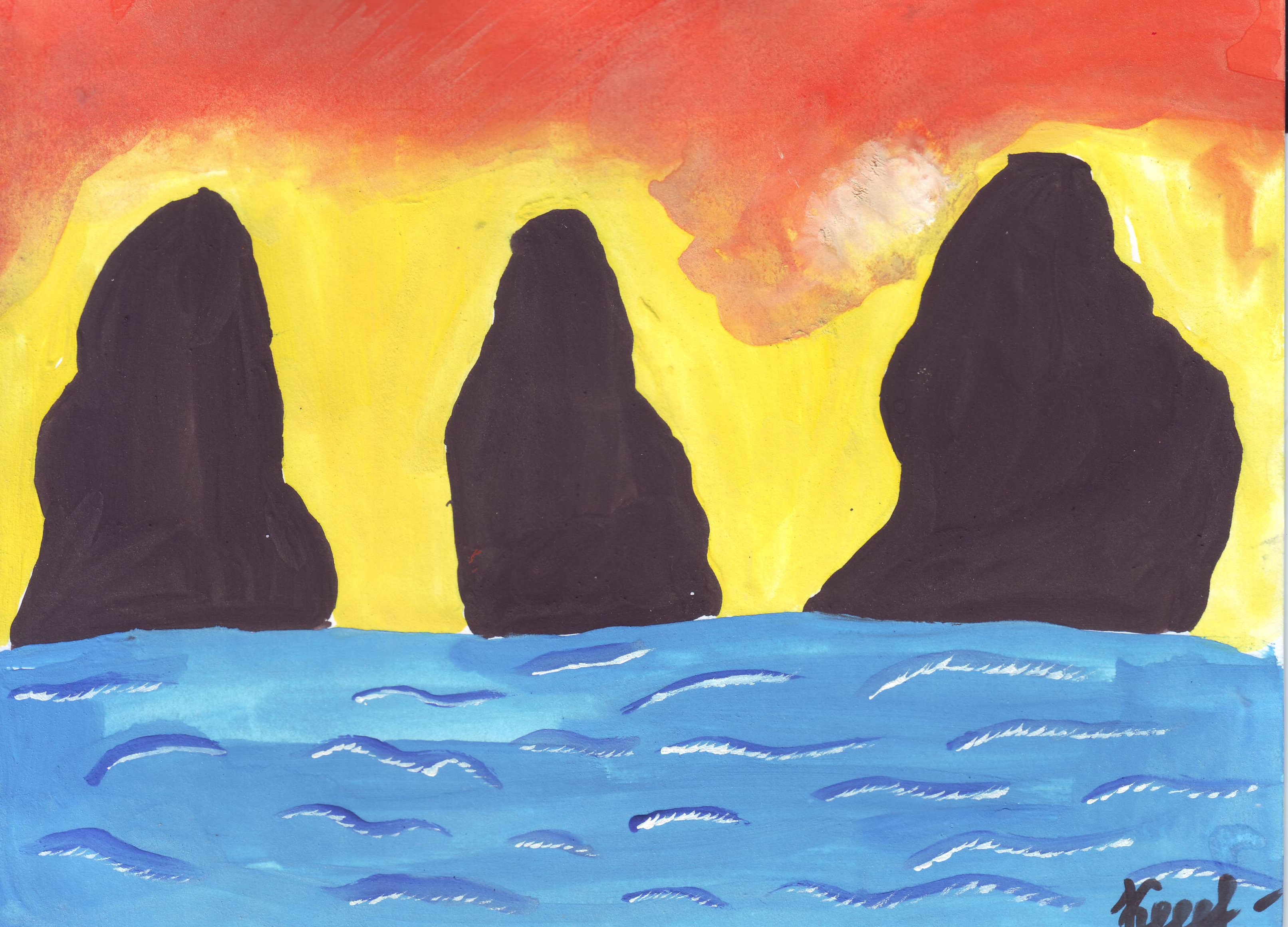 Виктория Г.: "Мне понравились скалы «Три брата», находящиеся в Сахалинской области... Я их нарисовала, потому что скалы мне напоминают терреконы родного Донбасса".