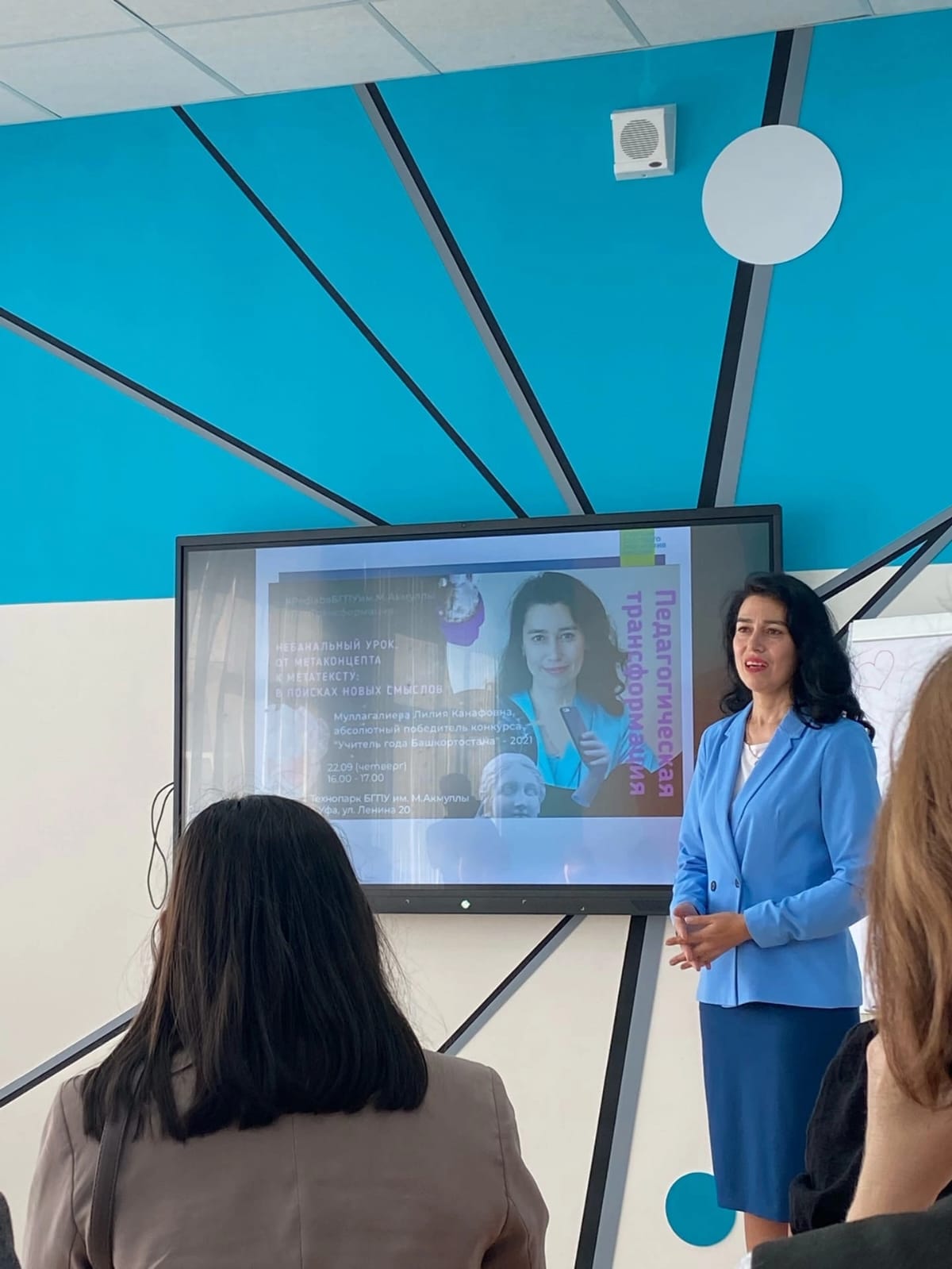 22 сентября 2022 г. в технопарке состоялся мастер-класс «Небанальный урок. От метаконцепта к метатексту: ищем, где собака зарыта», который посетили студенты 3 курса направления Педагогическое образование, профиль «Начальное образование» Института педагогики. Мастер-класс провела Лилия Канафовна Муллагалиева – абсолютный победитель конкурса «Учитель года Башкортостана» - 2021, учитель русского языка и литературы. Лилия Канафовна поделилась интересными методами и приемами при изучении данной темы. Желаем дальнейших успехов Лилии Канафовне и студентам, перенимающим опыт ведущих учителей.