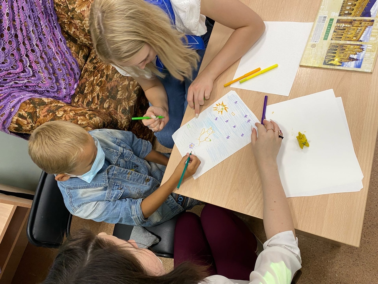 Дети прослушали аудиосказку в исполнении автора "Сказка про глухого волчонка, который любил слушать колыбельные". Потом вместе с волонтерами увлеченно рисовали и лепили персонажей по мотивам этой сказки.