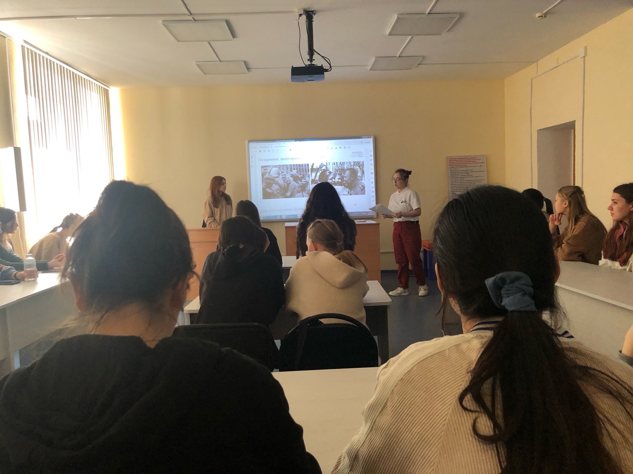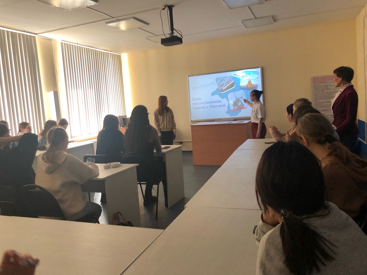 20 марта  2023 года в рамках просветительских мероприятий «Разговор о важном» для студентов 1 и 2 курсов, обучающихся по направлению «Начальное образование», была организована беседа на тему «День  воссоединения Крыма с Россией».  В качестве докладчиков выступили студентки 3 курса Николь Харисова и Анастасия Жарова (руководитель –  Е.А. Савельева, к.п.н., доцент кафедры ТиМНО). Студенты вспомнили важнуюдату  и историю воссоединения Крыма с Россией, расширили представления о культурных и природных объектах полуострова. Студентам был показан видеосюжет "Крым в сердце каждого из нас".  Особый интерес они проявили к практической части мероприятия —  интерактивной игре "Карта Крыма".