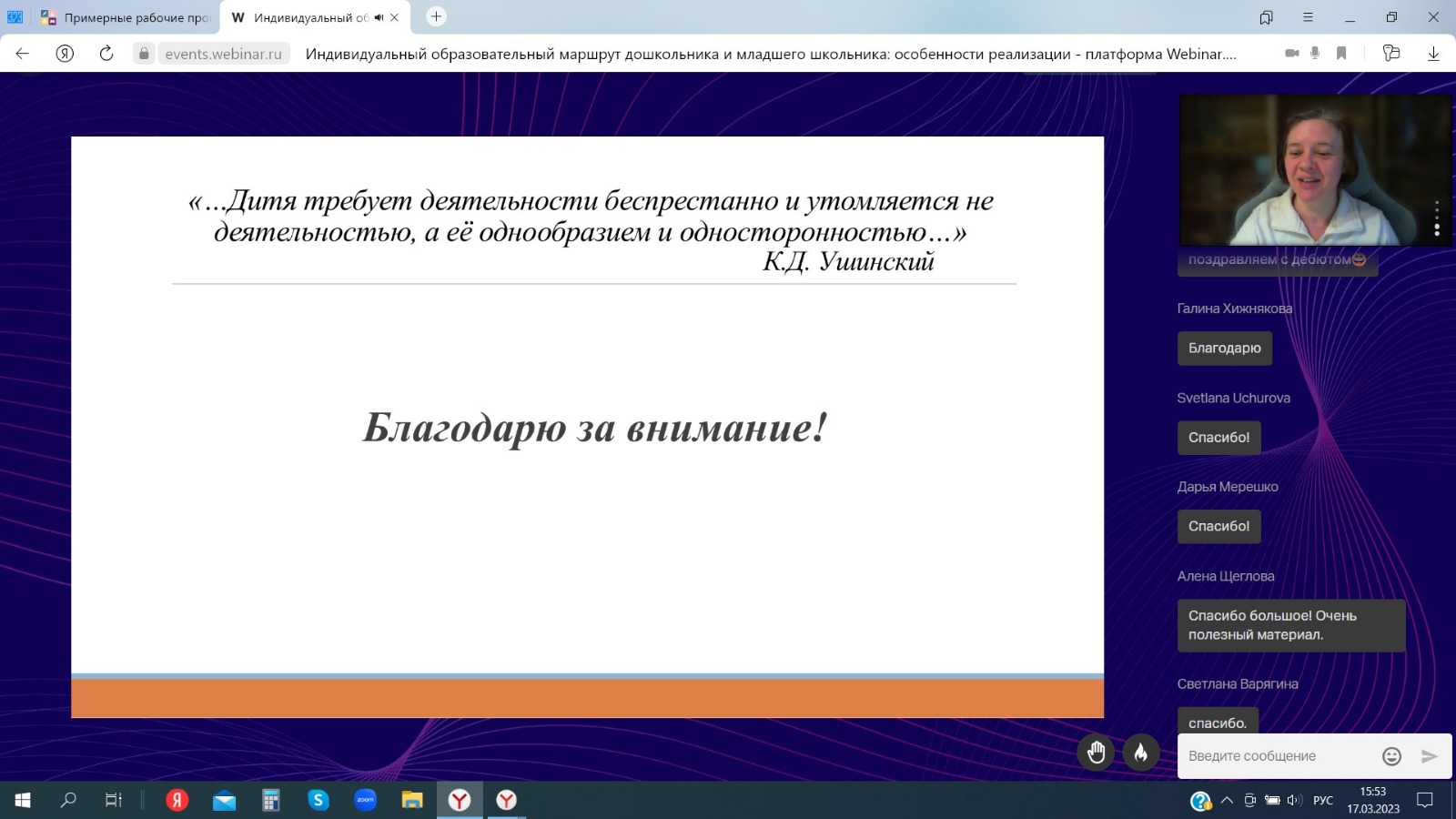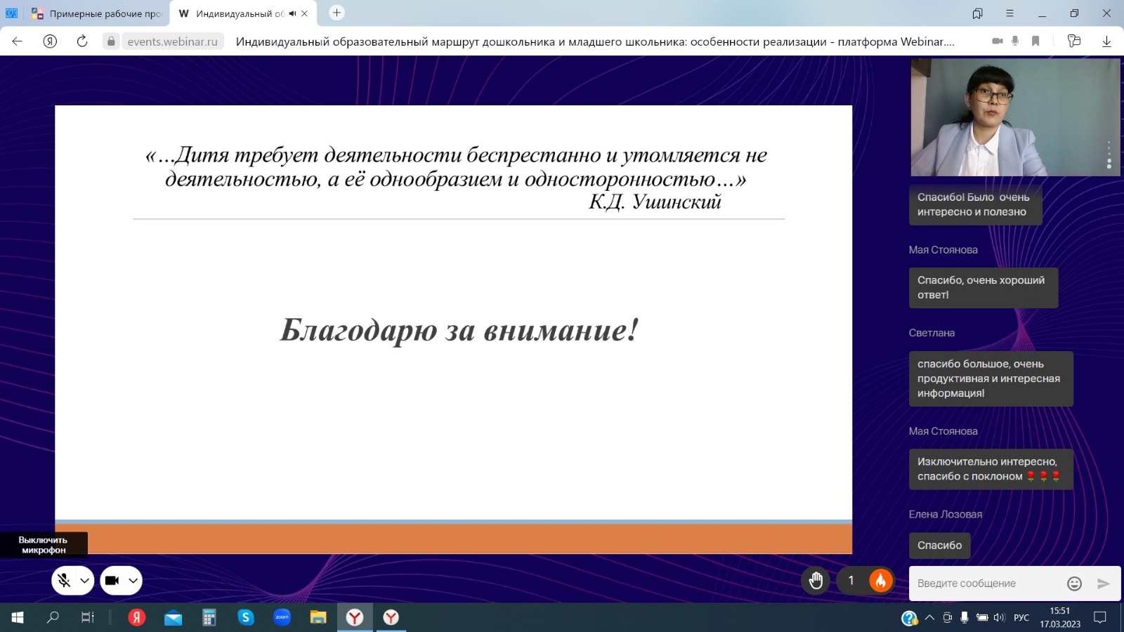 17 марта 2023 г. к.п.н., доцент кафедры теорий и методик начального образования Гульдар Фанисовна Ибрагимова провела вебинар по теме «Индивидуальный образовательный маршрут дошкольника и младшего школьника: особенности реализации». В ходе вебинара были раскрыты основные понятия в ракурсе нормативно-правовой документации, приведены примеры заполнения индивидуальных листов обучающихся.