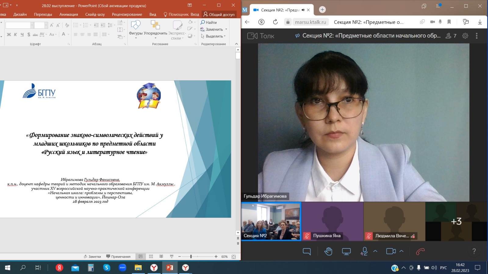 28 февраля 2023 года Ибрагимова Гульдар Фанисовна, к.п.н., доцент кафедры теорий и методик начального образования, выступила с докладом по теме «Формирование знаково-символических действий у младших школьников по предметной области «Русский язык и литературное чтение»» на XV Всероссийской научно-практической конференции «Начальная школа: проблемы и перспективы, ценности и инновации».