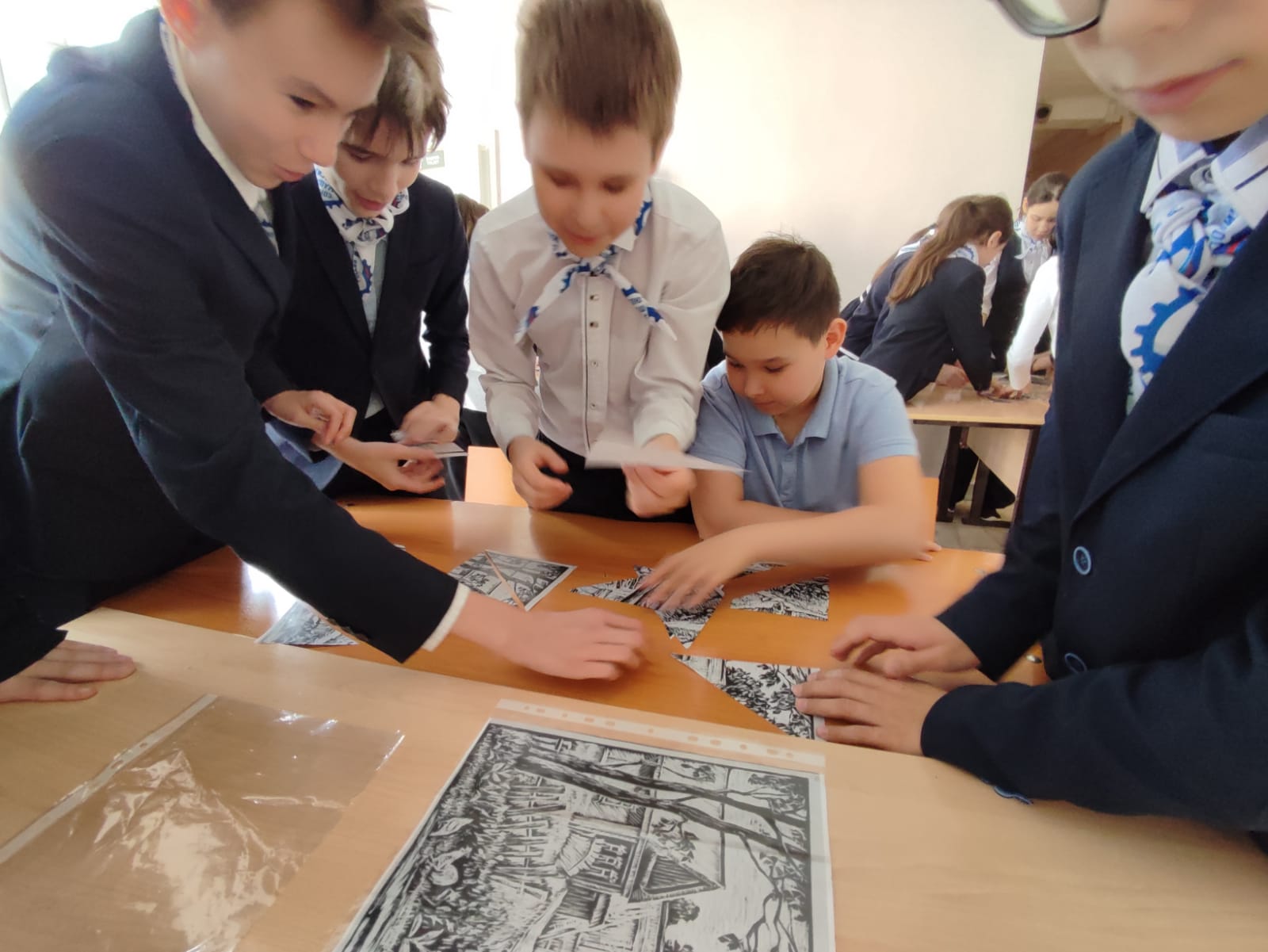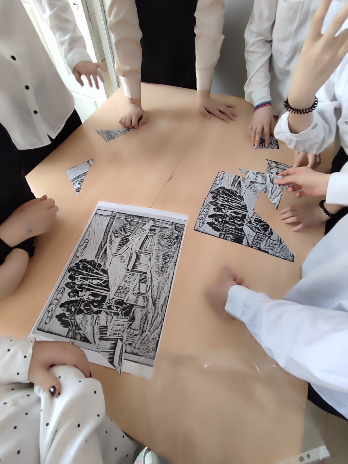 Дети ознакомились с экспозицией выставки и с большим интересом приняли участие в дидактической игре «Собери картину» (разработана Е.А. Савельевой), которая предполагала складывание пазлов, изготовленных на основе копий  линогравюр.