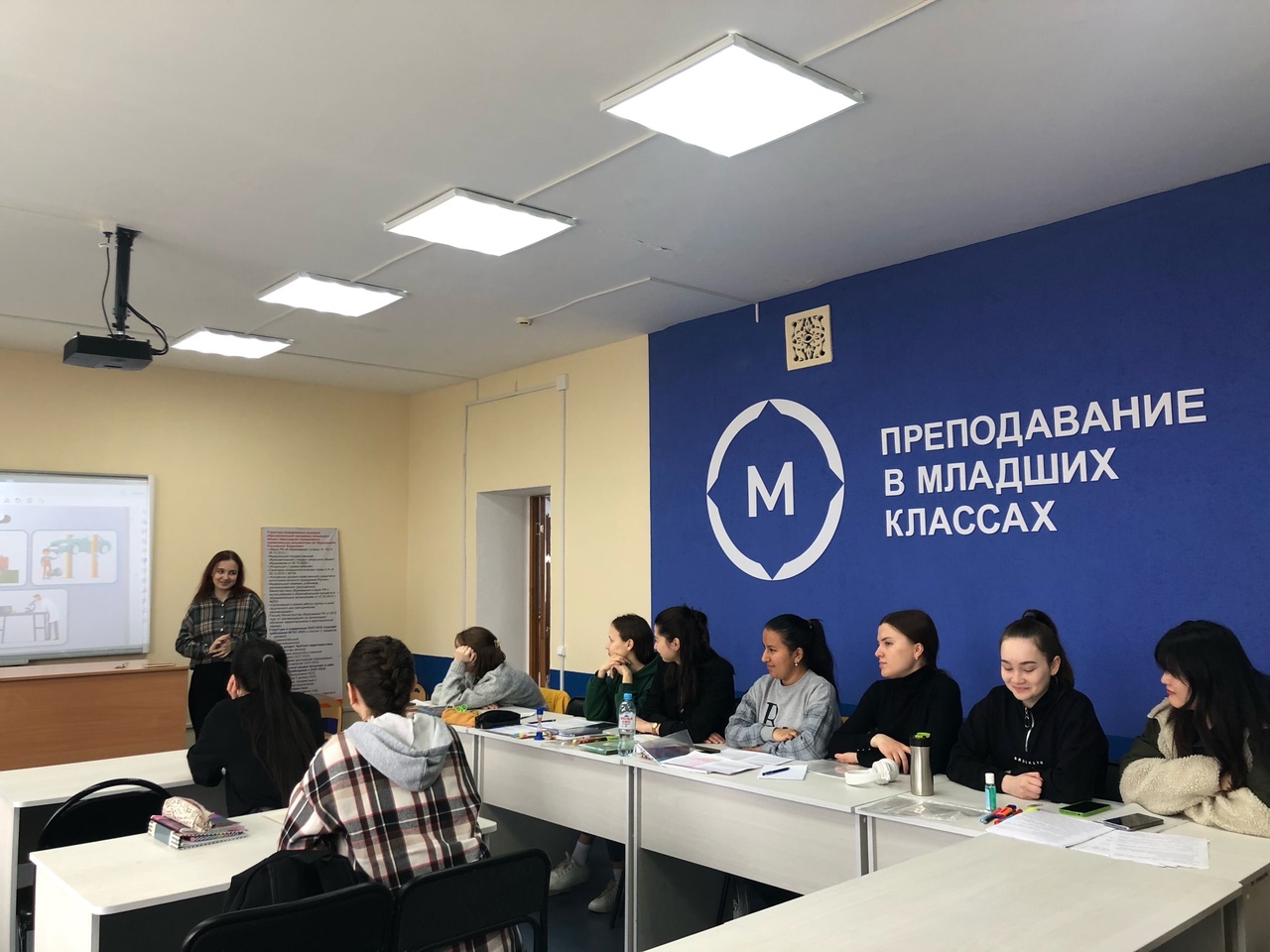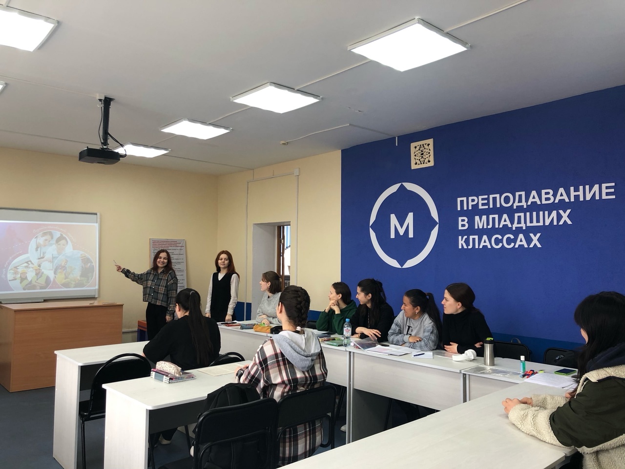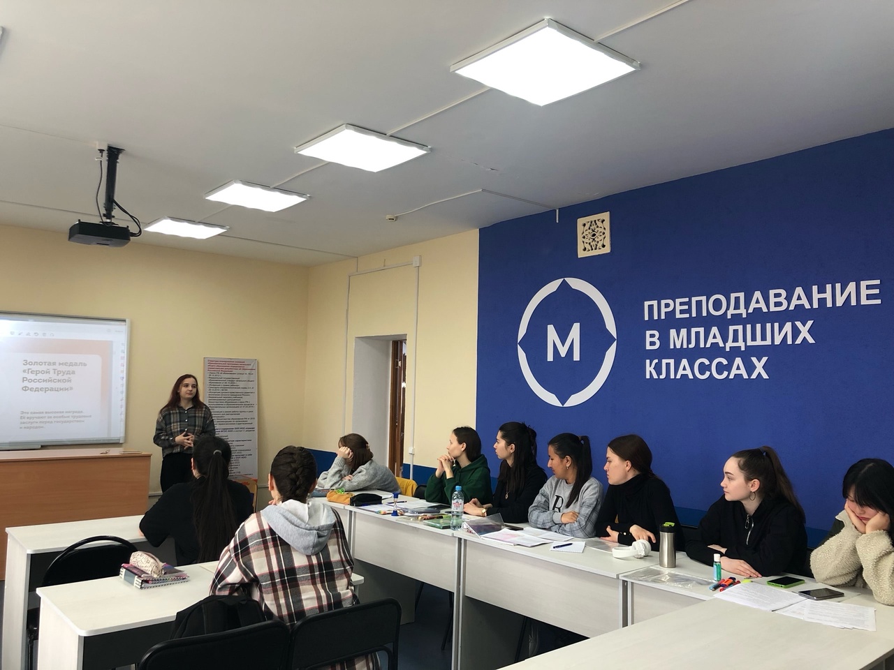 24 апреля 2023 года в рамках просветительских мероприятий «Разговор о важном» для студентов 1 и 2 курсов, обучающихся по направлению «Начальное образование», была организована беседа на тему «ДЕНЬ ТРУДА. МИР ПРОФЕССИЙ». В качестве докладчиков выступили студенты 3 курса Николь Харисова и Анастасия Жарова (руководитель – Е.А. Савельева, к.п.н., доцент кафедры ТиМНО).