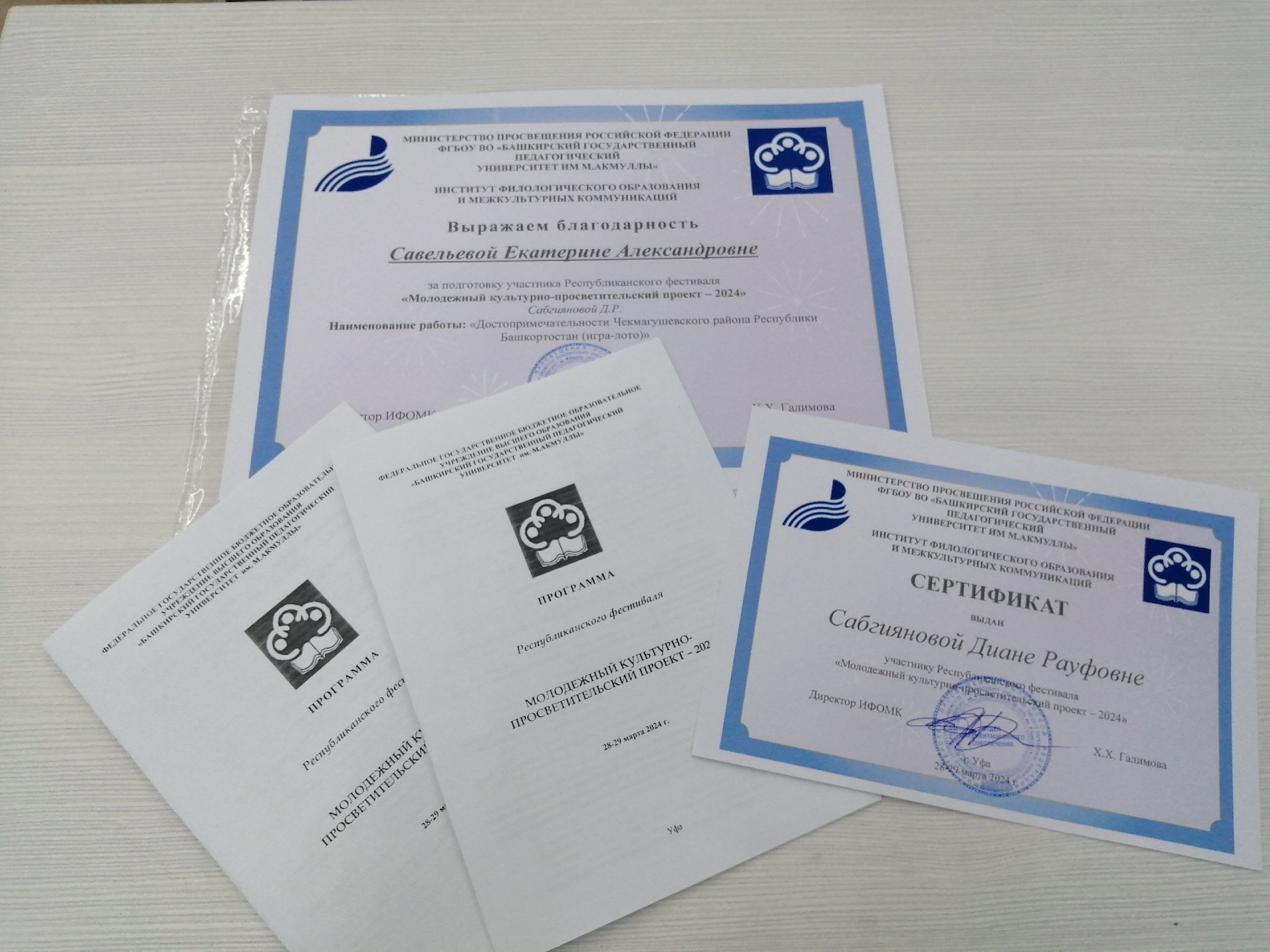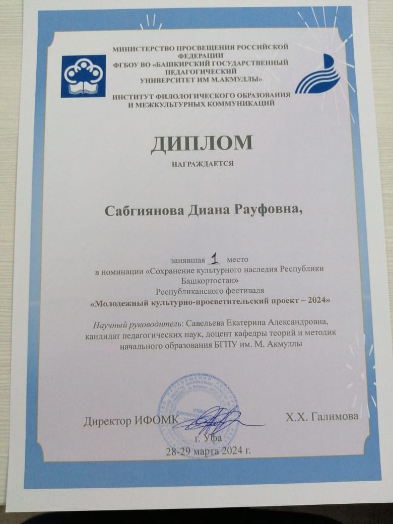 По результатам защит культурно-просветительских  проектов Диана Сабгиянова заняла 1 место в номинации «Сохранение культурного наследия Республики Башкортостан» Республиканского фестиваля «Молодежный культурно-просветительский проект – 2024».