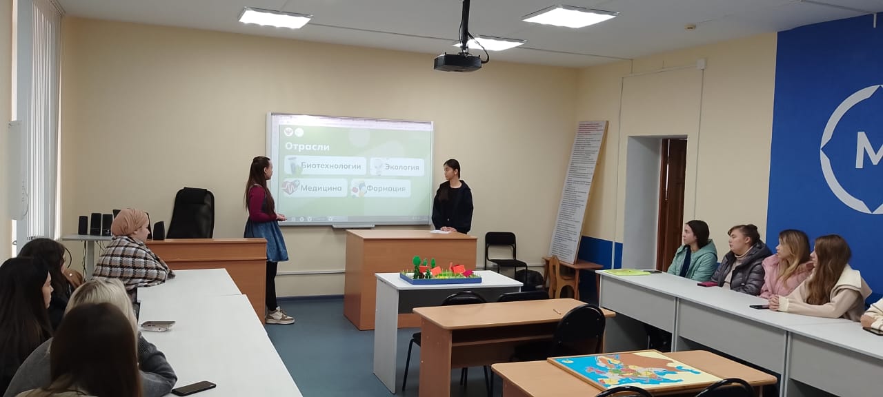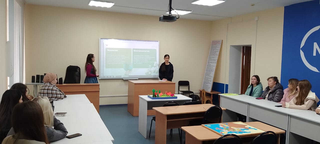 На мероприятии была организована беседа о достижениях России в отраслях «биотехнологии», «экология», актуальных задачах и перспективах. В ходе занятия студенты познакомились с особенностью работодателей, их географической представленностью, перспективной потребностью в кадрах, также с основными профессиями и содержанием профессиональной деятельности.