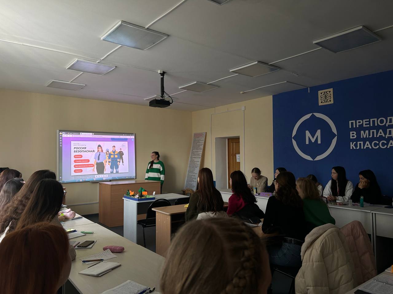 7 ноября 2024 года, в рамках курса «Россия – мои горизонты», для студентов 1 курсов, обучающихся по направлению «Педагогическое образование» профиль «Начальное образование», было проведено профориентационное занятие «Россия безопасная: полиция, противопожарная служба, служба спасения, охрана». Провели занятие студентки 3 курса направления «Педагогическое образование» профиль «Начальное образование» Елизавета Егорова и Тахмина Рысбаева (руководитель – Е.А. Савельева, к.п.н., доцент кафедры ТиМНО).