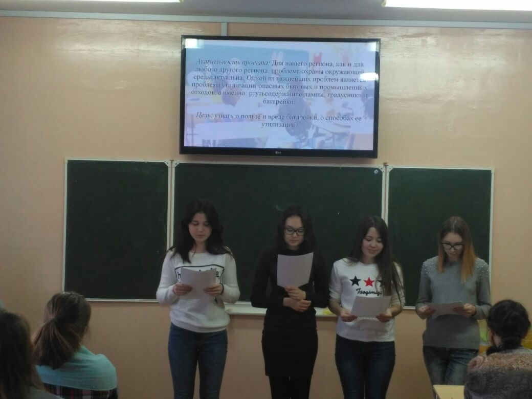 13 декабря 2017 года на базе кафедры теорий и методик начального образования прошло мероприятие для студентов 2 и 3 курсов ИП и магистрантов ИФОиМК, посвященное защите окружающей среды. Учащиеся узнали о том, как нужно правильно передавать на переработку опасные бытовые отходы - отслужившие срок эксплуатации батарейки и энергосберегающие лампы, что такое экобоксы, каков принцип их работы и где они располагаются. Студенты также успешно защитили разработанные ими учебно-воспитательные проекты по экологии.