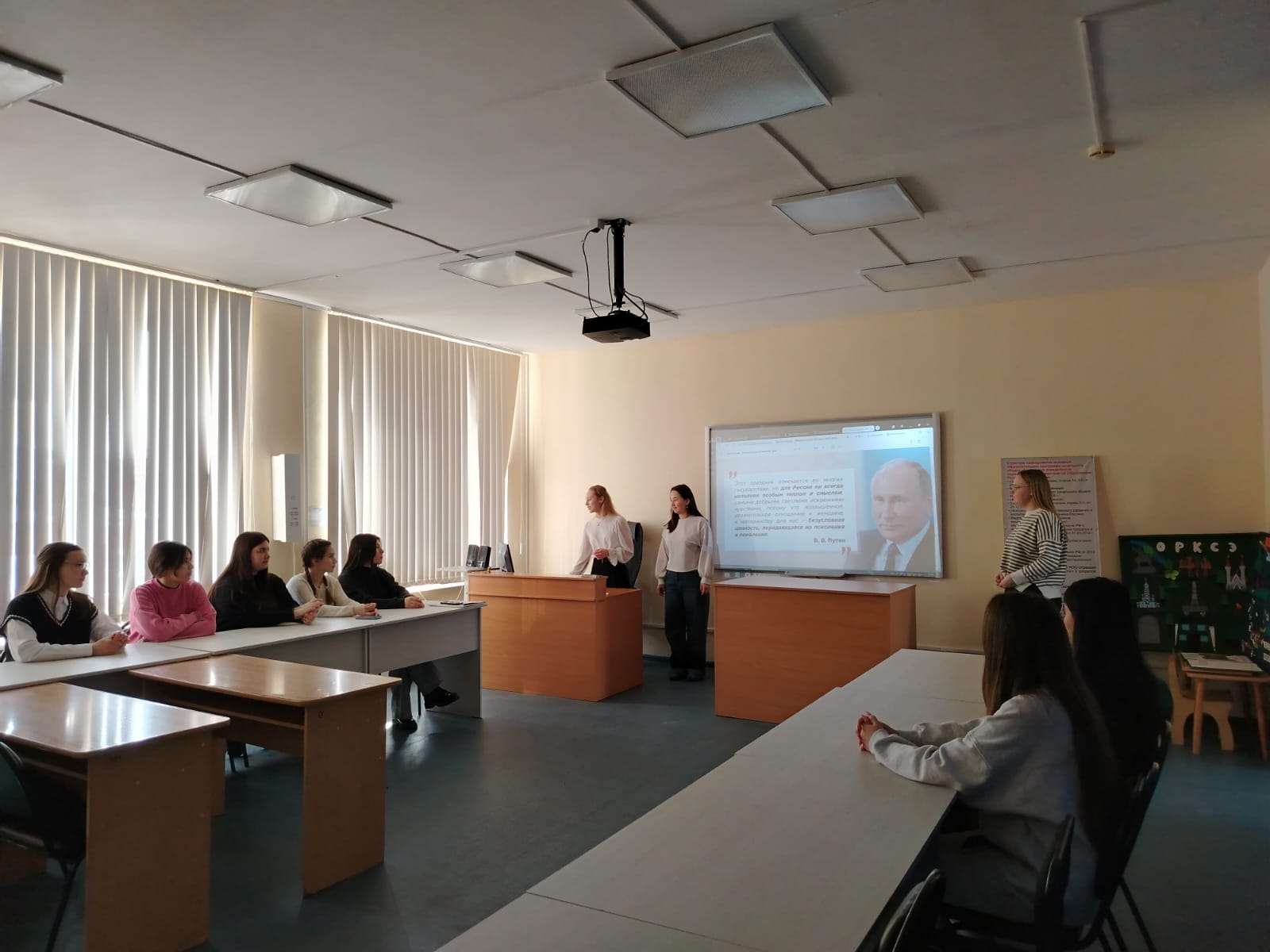 Цель: формирование и развитие у обучающихся первичных представлений о роли женщин в истории России, их вкладе в развитие различных сфер жизни и деятельности; формирование стремления к самореализации и служению обществу на примере выдающихся женщин России; воспитание ценностного отношения к семье и своим близким. На мероприятии была проведена беседа о том, что Международный женский день – это не только исторический символ борьбы за права, но и день признания вклада женщин в развитие института семьи, общества, науки, культуры и других сфер деятельности. Истории замечательных женщин России – это истории про стремление к мечте, преодоление трудностей и служение Отечеству. Вклад женщин в различные сферы жизни, такие как наука, техника, культура и экономика, имеет огромное значение и способствует развитию общества, обеспечивая равновесие, разнообразие и прогресс. Материнство, воспитание детей, забота о семье — важнейшие роли женщин в обществе. Современные женщины играют важную роль в жизнь страны, успешно сочетая рождение и воспитание детей, заботу о семье с работой в различных сферах и активным участием в общественной жизни. В мероприятии приняло участие более 50 студентов.