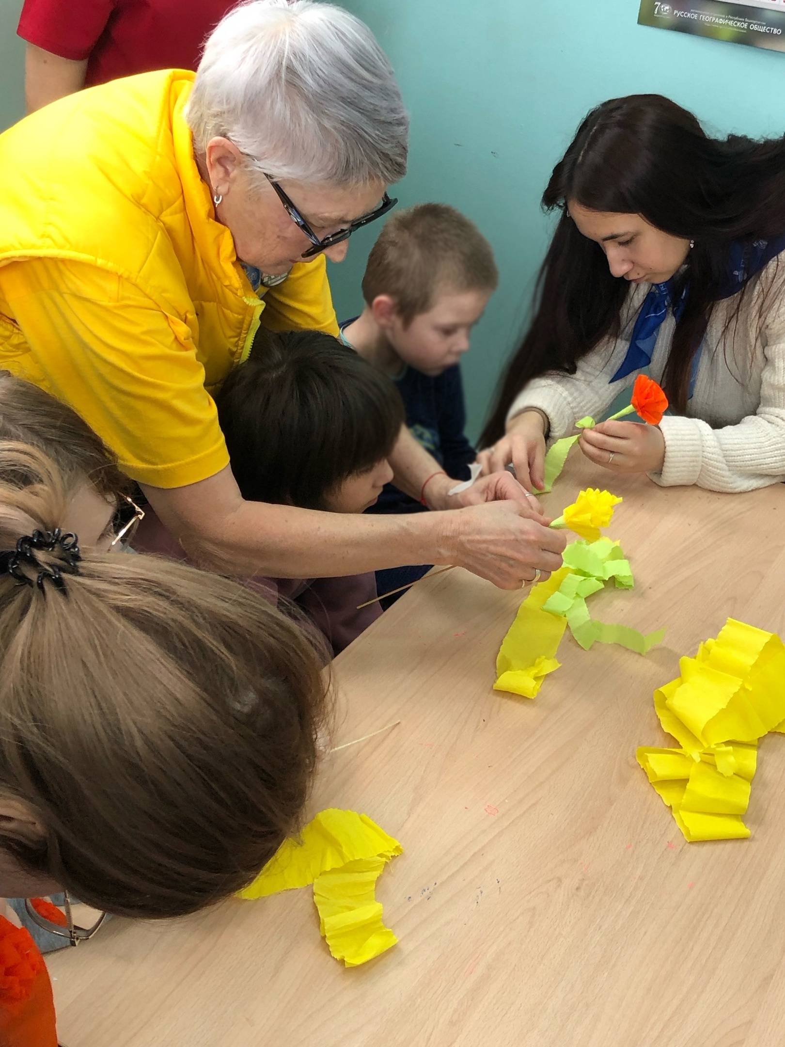 Затем, под руководством волонтеров, дети и подростки изготовили этот замечательный цветок своими руками во имя Памяти тех, кто подарил нам мирную жизнь.
