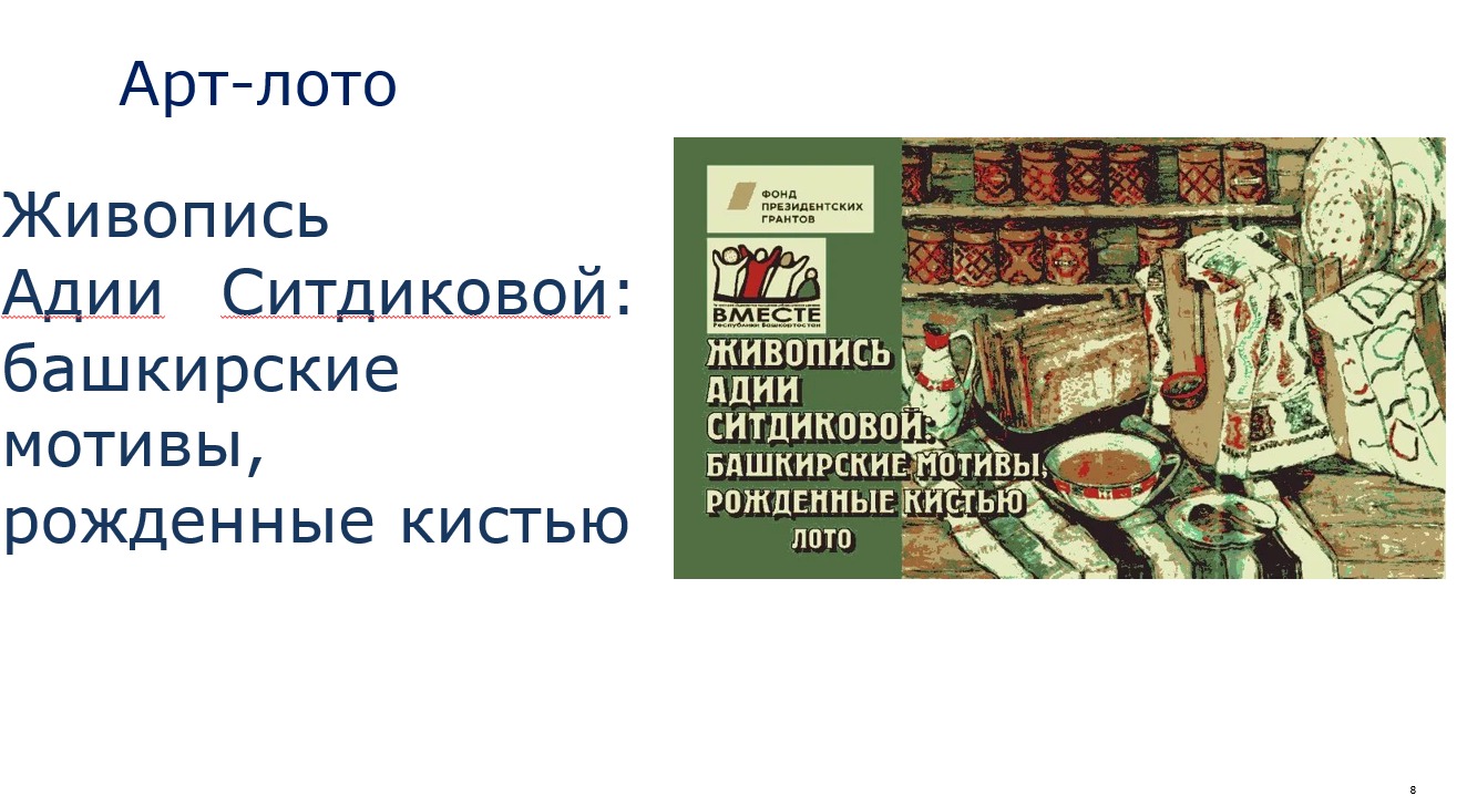 Адия Ситдикова - знаменитая художница Башкирии. Играя в эту игру мы знакомим детей с мастером натюрморта Адией Ситдиковой. Игра развивает интерес к натюрморту, изучению творчества А.Х. Ситдиковой, развивает понимание культурных традиций, память, наблюдательность, творческую активность. Кроме того, совместные творческие занятия и игры выступают средством укрепления детско-родительских отношений, налаживания эмоциональной связи и формирования навыков эффективной коммуникации.