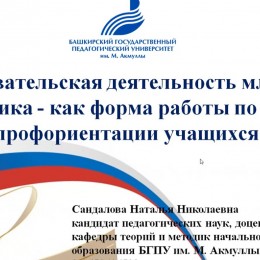 К.п.н., доцент Сандалова Н.Н. представила актуальную тему «Исследовательская деятельность младшего школьника – как форма работы по ранней профориентации учащихся». В докладе были рассмотрены методологические основы интеграции исследовательской активности в процесс профессионального самоопределения младших школьников, подчёркнута роль учителя и родителей в формировании интереса к будущим профессиям через практические открытия и исследовательскую деятельность.