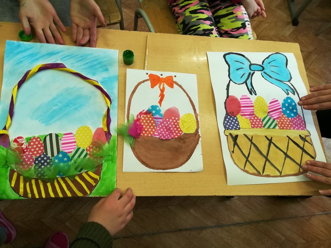 Регина Гареева: «Скоро праздник Пасхи, поэтому занятие с детьми я запланировала в виде аппликации, с украшением корзины, внутри которой будут уложены разноцветные пасхальные яйца. Все воспитанники работали творчески, с увлечением, вкладывая душу в процесс создания поделки.