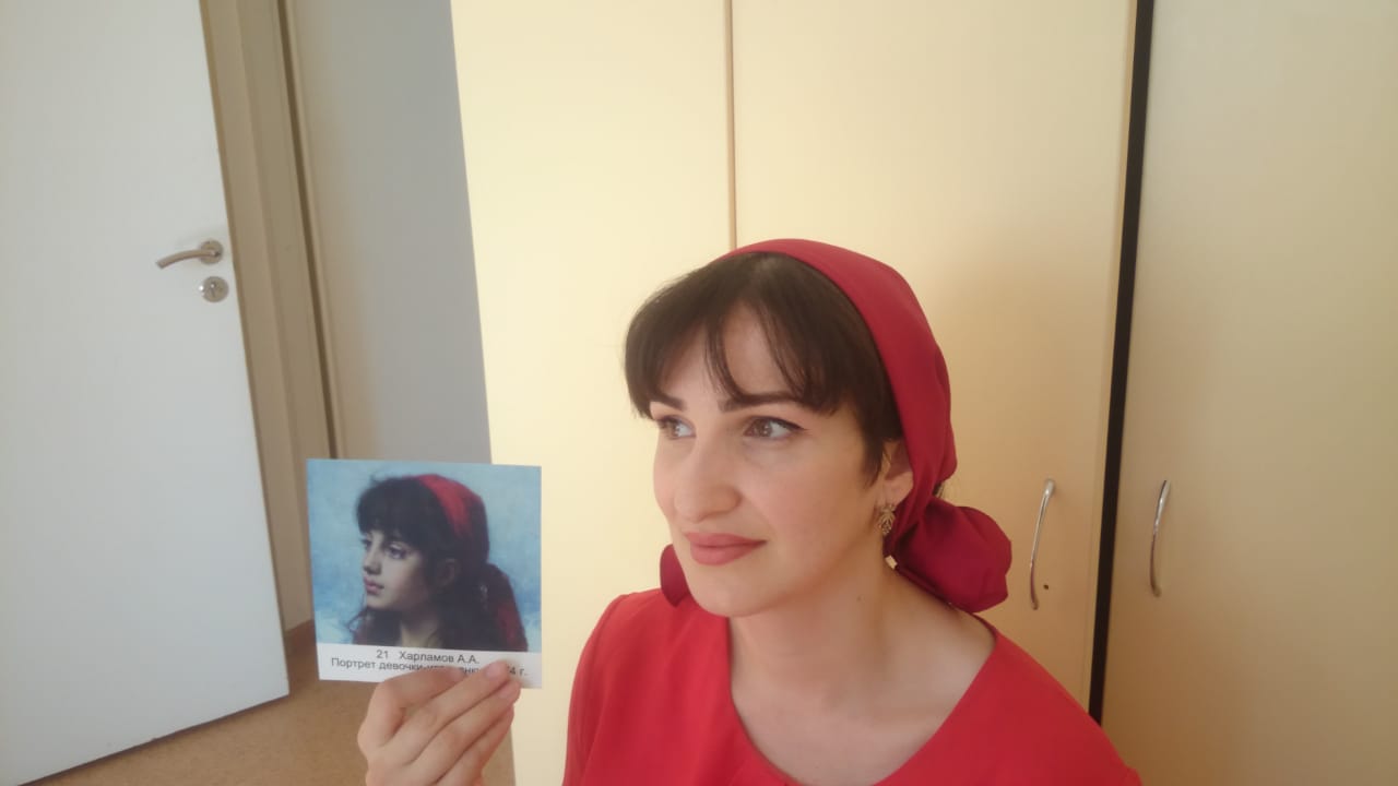 Игра  входит в серию развивающих игр-лото «Портрет Башкортостана» и предоставляет возможность знакомства с живописными произведениями из коллекции БГХМ им. М.В. Нестерова. Также с участниками была проведена игра «Живые картины». Через позы и жесты участники передавали изображение картины. Нужно было отгадать, какая картина изображается участниками пантомимы. На фото: создание образа девушки-итальянки с картины А.Харламова.