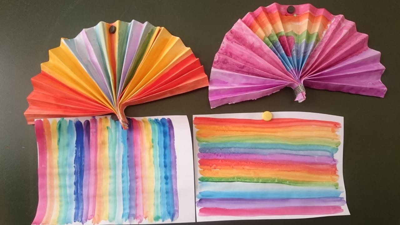 Екатерина Ларькова: Мы создавали веера, разукрашивали яркими красками, ребята помогали друг другу их разукрашивать, сгибать гармошкой, склеивать. Ребята очень старались, выполнили радужные веера. В целом, занятие прошло активно, весело.