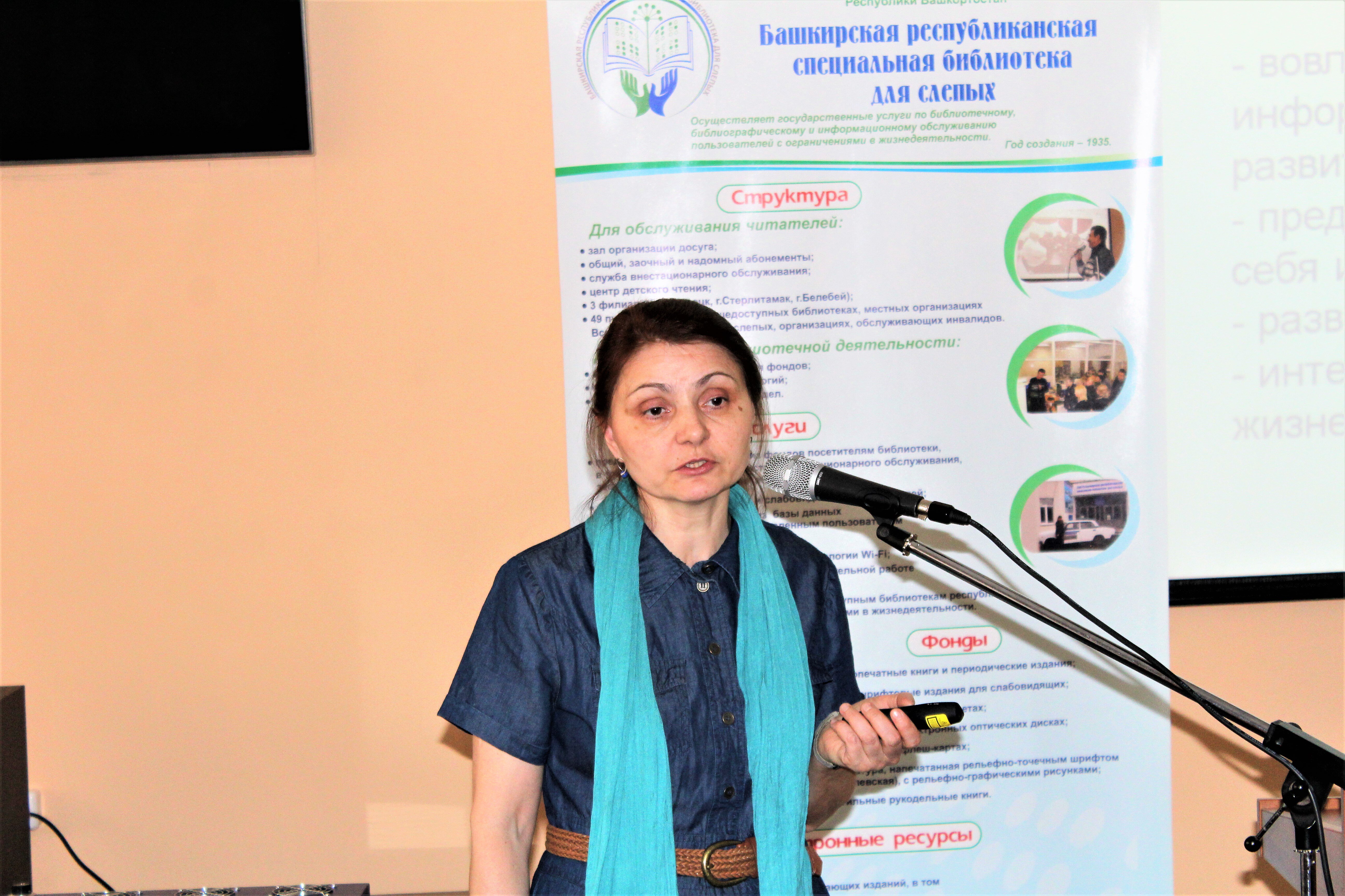 С докладом «Адаптированная литература для людей с ограничениями жизнедеятельности в популяризации национально-культурного достояния народов России в Республике Башкортостан» выступила директор Башкирской республиканской специальной библиотеки для слепых, кандидат педагогических наук, Айгуль Аминева. Она поделилась опытом работы, применяемыми методами в продвижении национальной литературы к читателям и пользователям специальной библиотеки.