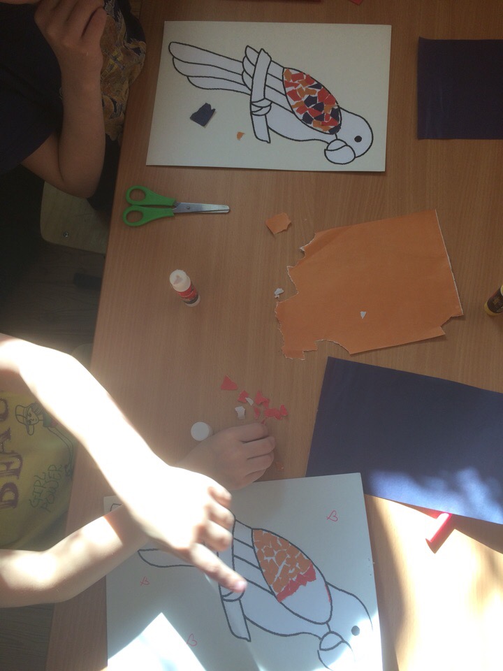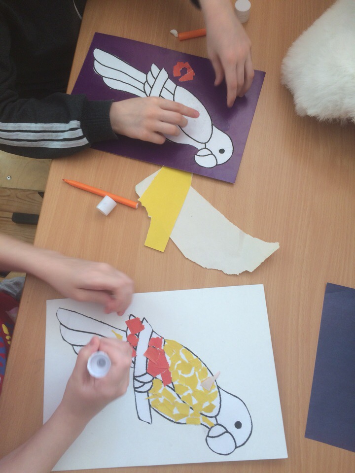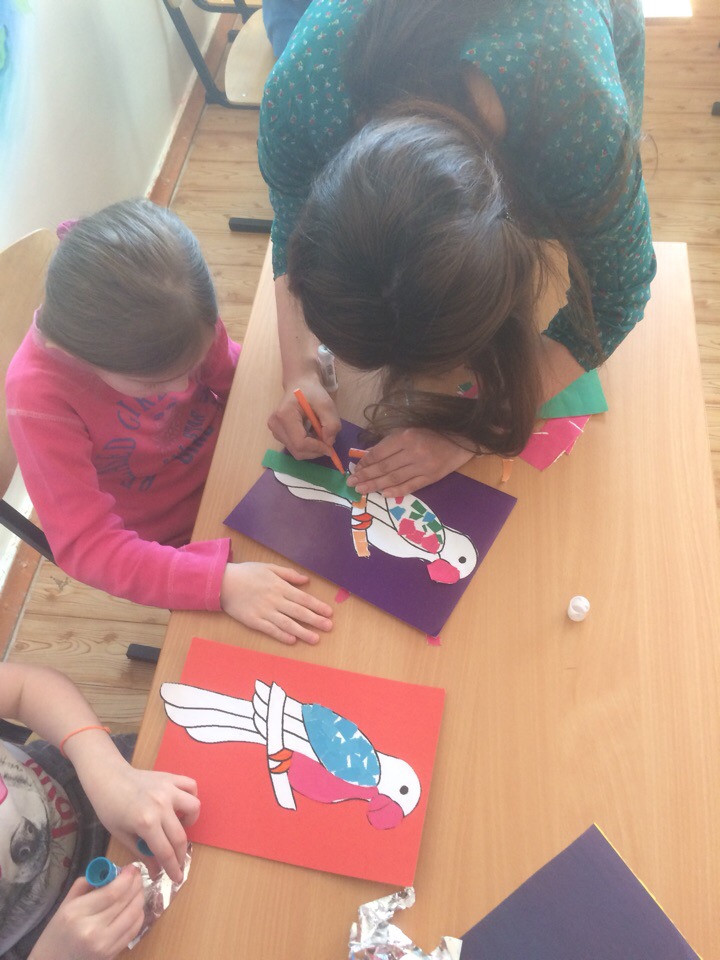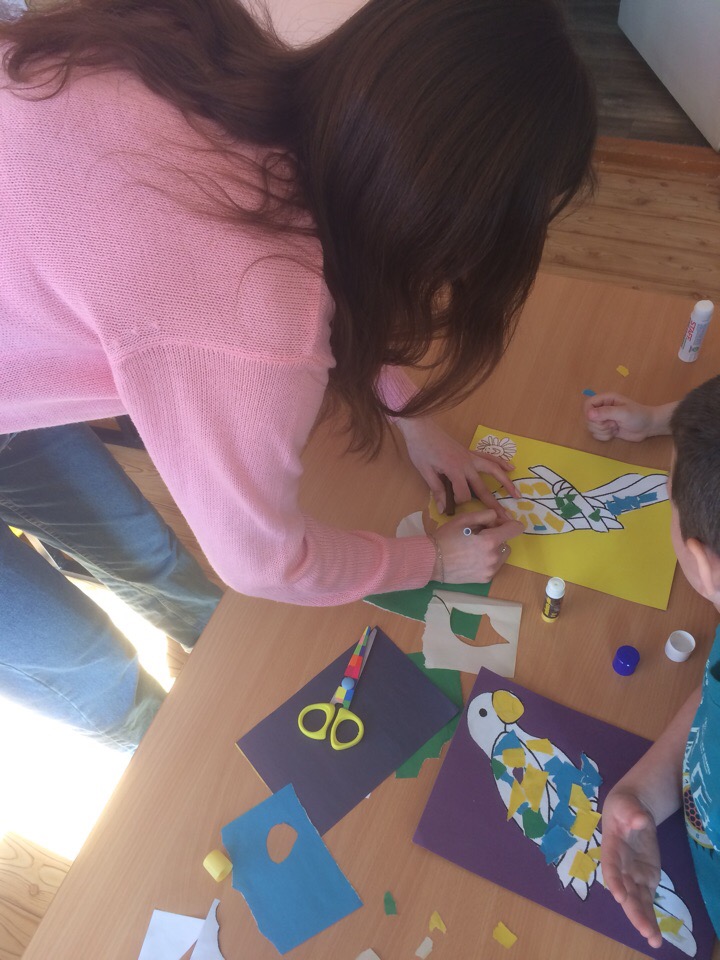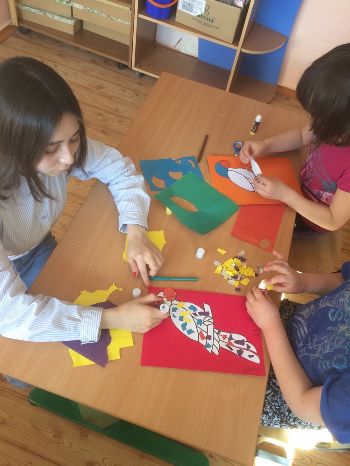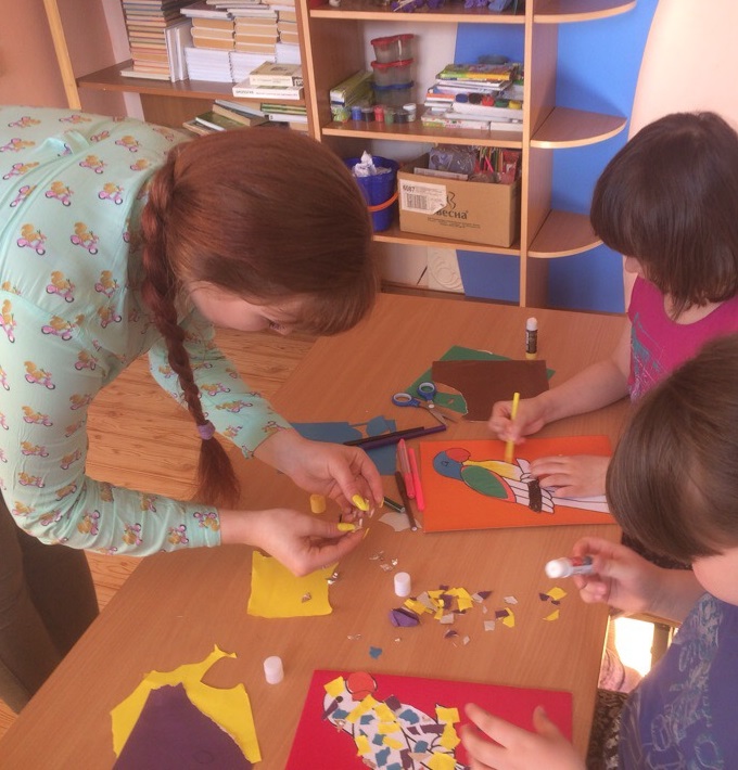 Даша Бакулева: Мы провели занятие «Попугайчик» в технике аппликации из бумаги. Деткам очень понравилось работать с цветной бумагой, рисовать попугайчиков. Весенний день выдался очень солнечным и тёплым, мы на это обратили внимание детей, и это очень позитивно повлияло на наше занятие - дети изобразили в своих работах попугайчиков яркими, веселыми, красивыми! Для того, чтобы поднять мотивацию детей, мы сказали, что этот попугайчик – волшебный и он обязательно принесет удачу! Каждый ребёнок с трепетом выполнял работу и старался сделать как можно лучше свою работу. Для того чтобы занятие было более запоминающимся, необычным и радостным мы включили детскую музыку и во время аппликации мы даже успели попеть с ребятами. Особенно меня впечатлило то, что семилетняя воспитанница приюта свою творческую работу -  попугайчика подарила мне. Мне очень понравилось работать с детишками и я знаю одно - вернусь  к ним обязательно снова!