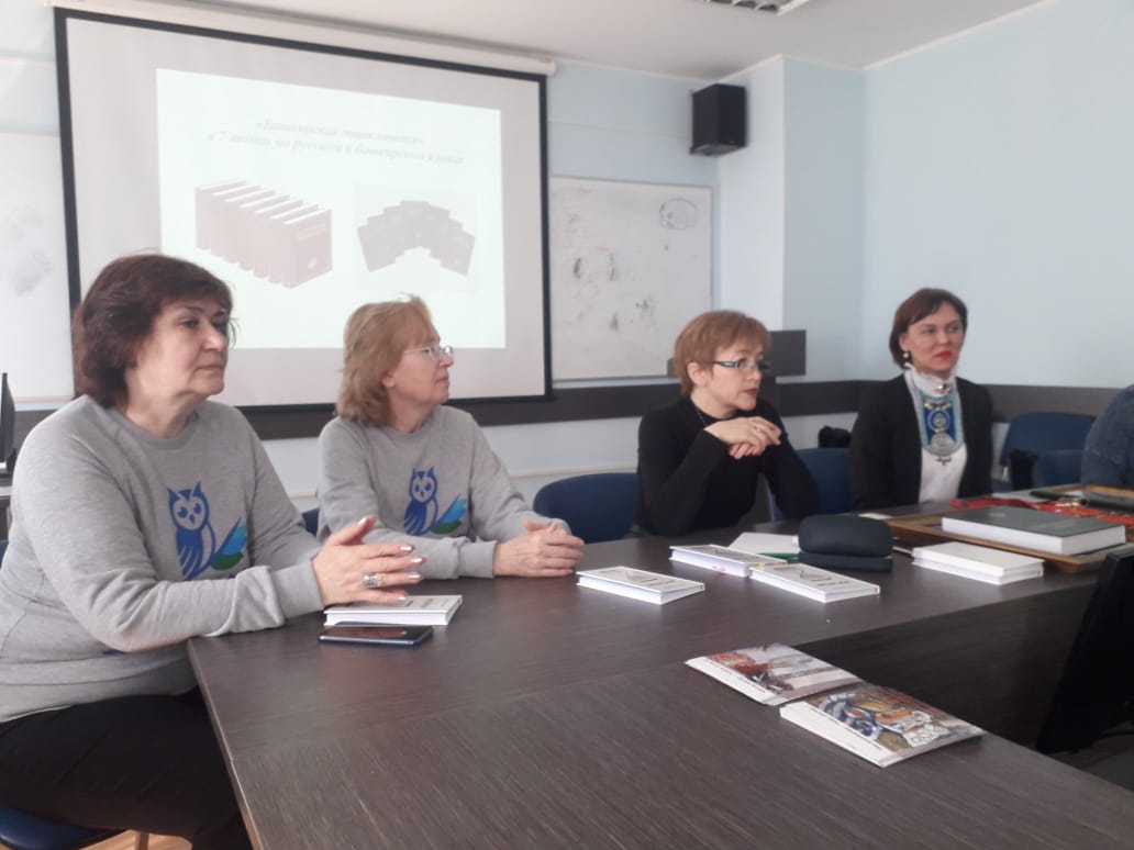 Встреча была разделена на три части. В первой части Клара Аглиуллина  рассказала об особенностях научно-справочных изданий как источниках информации, о направлениях и итогах деятельности ГАУН РБ «Башкирская энциклопедия», ознакомила с башкирскими энциклопедиями.