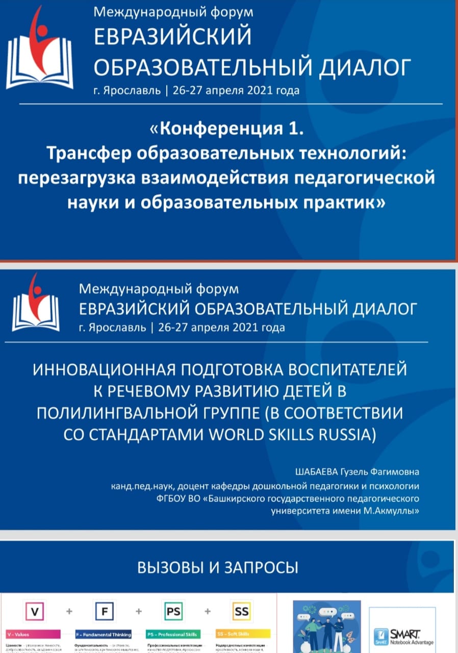 к.п.н., доц. Шабаева Г.Ф. приняла участие в Международном форуме с темой доклада "Инновационная подготовка воспитателей к речевому развитию детей в полилингвальной среде ДОО (в соответствии со стандартами World Skills). ГАУ ДПО ЯО «Институт развития образования»   26-27 апреля 2021 года в городе Ярославле Международного форума «ЕВРАЗИЙСКИЙ ОБРАЗОВАТЕЛЬНЫЙ ДИАЛОГ».