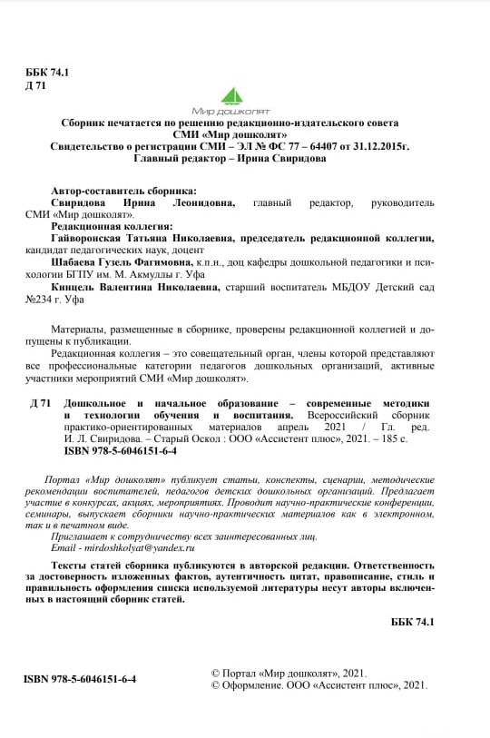 Публикация кафедры ДПиП в практико-ориентированных материалов "Дошкольное и начальное образование - современные методики и технологии обучения и воспитания"