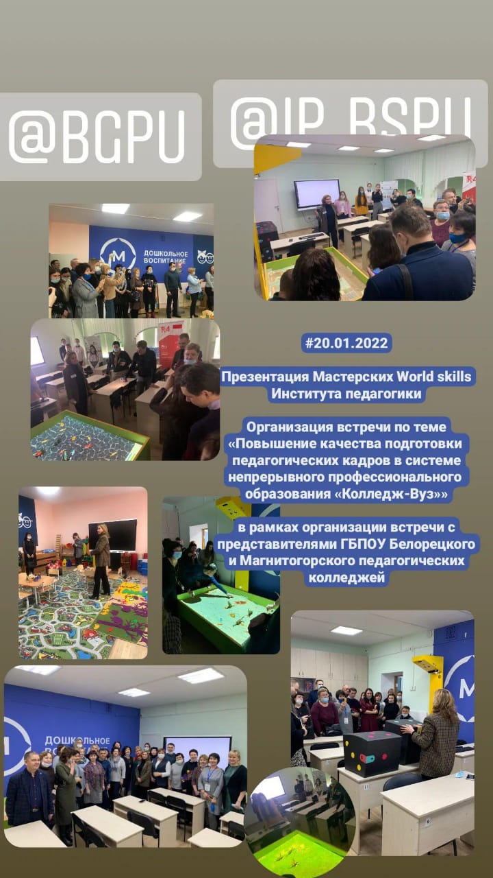Научно-методическая  встреча по теме «Повышение качества подготовки педагогических кадров в системе непрерывного профессионального образования «Колледж-Вуз» в рамках организации встречи с представителями ГБПОУ Белорецкого и Магнитогорского педагогических колледжей прошла успешно на базе мастерских World Skills по компетенциям: "Дошкольное воспитание" кафедры ДПиП ,"Преподавание в младших классах" кафедры ТиМНО Института педагогики Акмуллинского университета.