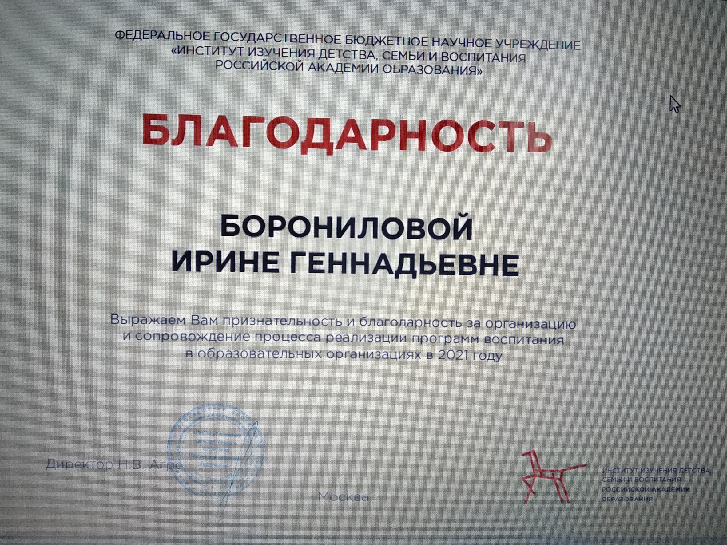 На имя зав. кафедрой дошкольной педагогики и психологии Борониловой И.Г. поступила  благодарность  за организацию и сопровождение процесса реализации программ воспитания в образовательных организациях в 2021 году от ФЕДЕРАЛЬНОЕ ГОСУДАРСТВЕННОЕ БЮДЖЕТНОЕ НАУЧНОЕ УЧРЕЖДЕНИЕ «ИНСТИТУТ ИЗУЧЕНИЯ ДЕТСТВА, СЕМЬИ И ВОСПИТАНИЯ РОССИЙСКОЙ АКАДЕМИИ ОБРАЗОВАНИЯ"