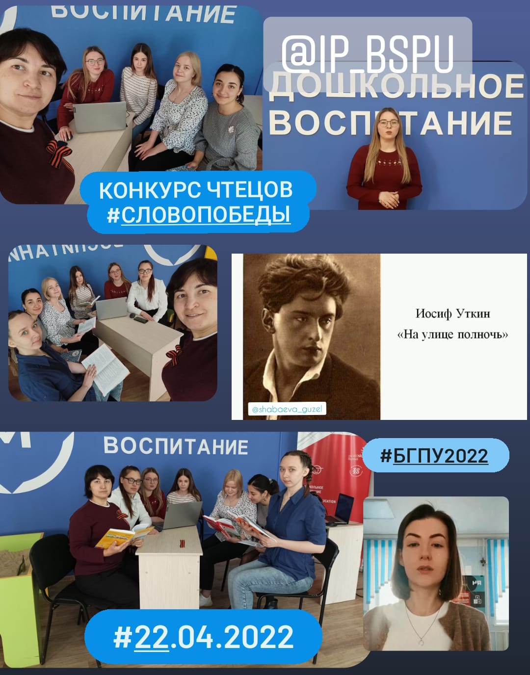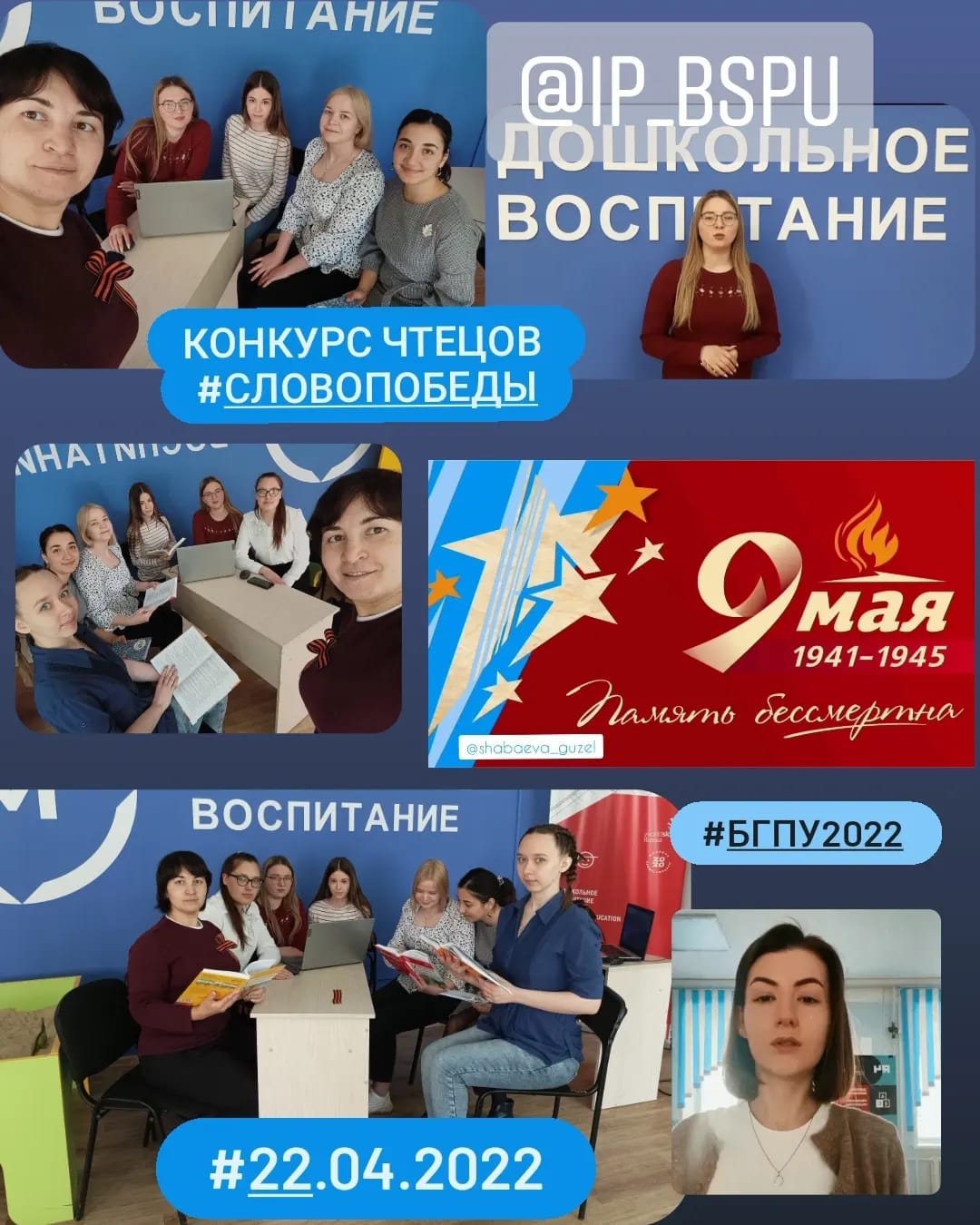 22.04.2022 На кафедре Дошкольной педагогики и психологии преподавателями Шабаевой Г.Ф., Пилипенко Е.А. проведен конкурс чтецов «Слово Победы», посвященный 77-летию Победы в Великой отечественной войне среди студентов направления 44.03.01-Педагогическое образование, профиля подготовки  «Дошкольное образование»