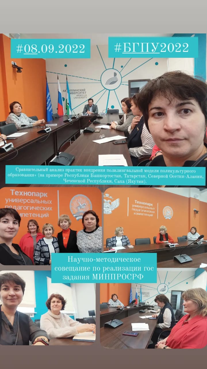 08.09.2022 г. к.п.н., доц. Шабаева Г.Ф. приняла участие в работе научной рабочей группы в рамках  научно-методического совещания с ректором БГПУ им. М.Акмуллы Сагитовым Салаватом Талгатовичем – председателем Совета ректоров вузов РБ в рамках  государственного задания Министерства Просвещения РФ «Сравнительный анализ практик внедрения полилингвальной модели поликультурного образования» (на примере Республики Башкортостан, Татарстан, Северной Осетии-Алании, Чеченской Республики, Саха (Якутии).