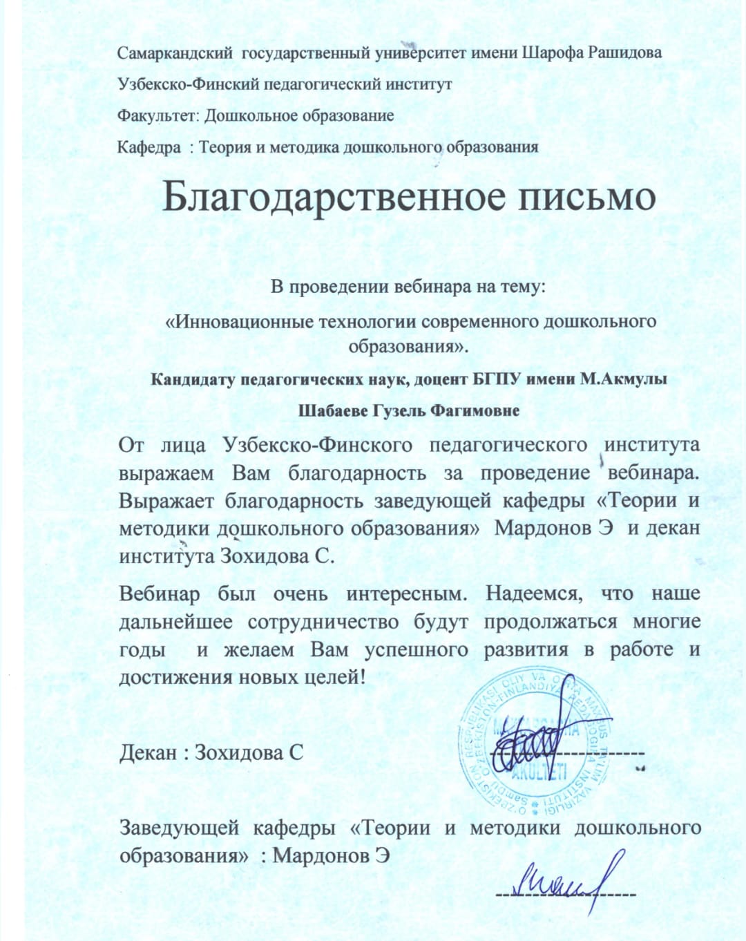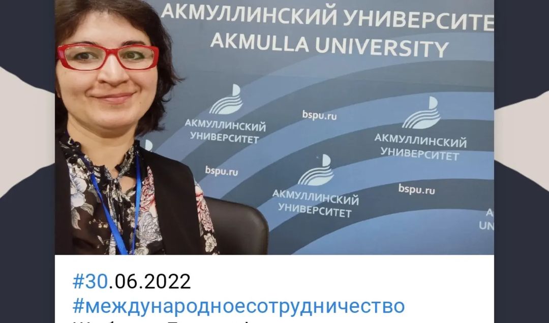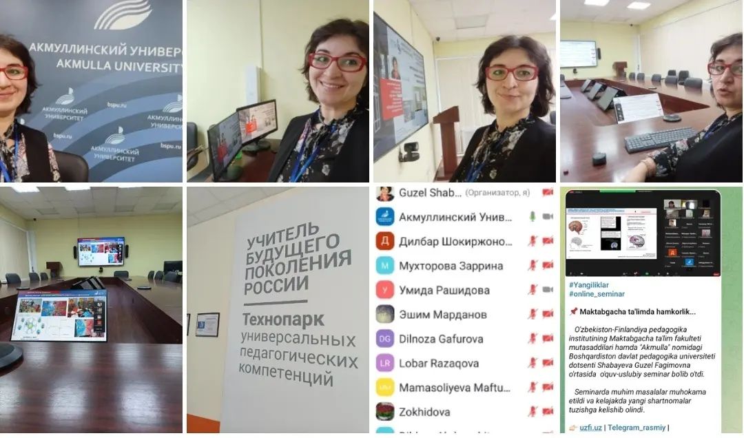 30.06.2022г. Шабаева Гузель Фагимовна к. п.н., доцент Акмуллинского университета провела цикл мероприятий с преподавателями,  магистрантами, студентами Узбекистанский-Финляндский педагогический институт  Самаркандского государственного университета: научная  консультация по организации диагностических процедур проведения мониторинга и оформления результатов экспериментального  исследования в диссертации; цикл лекций по инновационным технологиям современного образования. Научный диспут осуществлён с участниками образовательных отношений, заслушен доклад с результатами работы Шокиржоновой Дилбар Шокиржон кизи, магистрантом 1 курса  Узбекистанский-Финляндский педагогический институт  Самаркандского государственного университета Научный руководитель: к.п.н., доцент Шабаева Гузель Фагимовна
