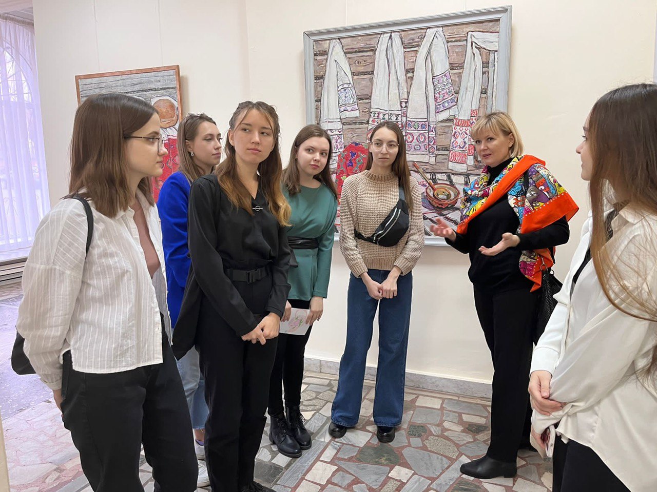 Посещение выставочного зала «Ижад» всегда поражает разнообразием выставочных экспонатов, просматривая которые, невольно попадаешь на проводимые здесь же мастер-классы по рукоделию, домоводству, дизайну интерьеров и многое другое. Пестрота эмоций и впечатлений надолго остается в памяти не только кураторов выставок, но и студентов. Так же произошло и в этот раз, при знакомстве с творчеством удивительного художника А.Х. Ситдиковой. По картинам Адии Хабибулловны можно изучить все многообразие башкирских орнаментов, стилей вышивок, быт и убранство башкирских домов. Все картины наполнены жизненным оптимизмом, теплом и радостью. Находясь в живой атмосфере картин, заботлив и внимателен ко всем деталям, словно радушная хозяйка Адия Хабибулловна приглашает в избу разделить семейную трапезу. И происходит взаимодействие между маленькими посетителями с художественной школы и нашими студентами-дошкольниками, которые так заботливо объясняют непонятные для детского мышления сюжеты, отображая их в своих рисунках (куратор Пилипенко Е.А.).
