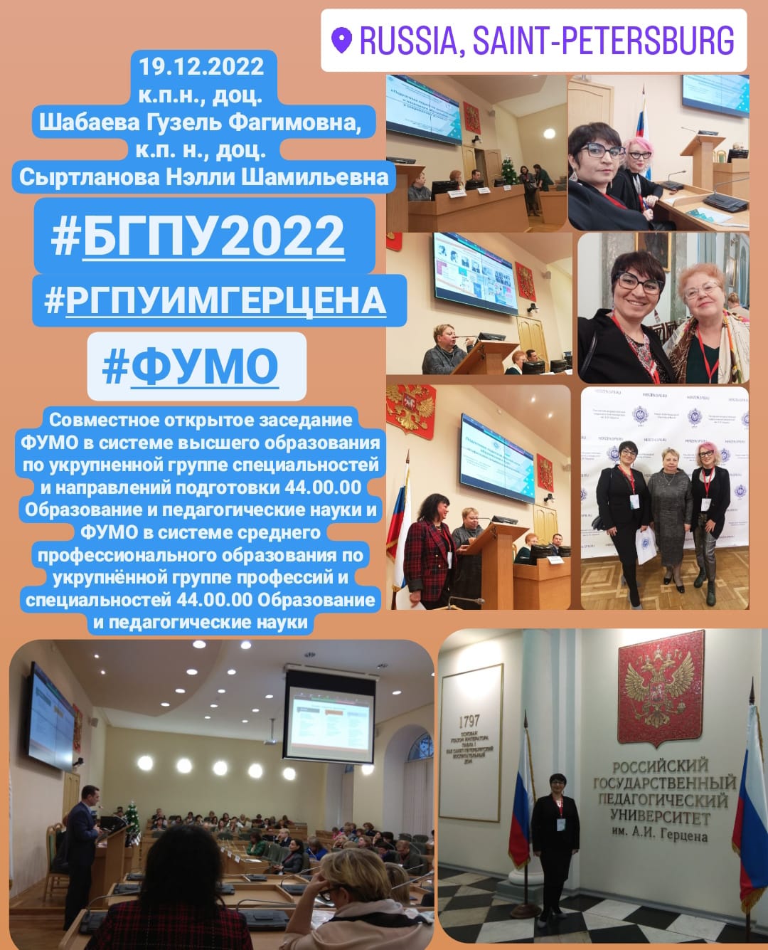 19.12.2022г ППС кафедры ДПиП Акмуллинского университета: к. п.н., доц. Шабаева Гузель Фагимовна, к.п. н., доц. Сыртланова Нэлли Шамильевна приняли участие в совместном открытом заседании ФУМО в системе высшего образования по укрупненной группе специальностей и направлений подготовки 44.00.00 Образование и педагогические науки и ФУМО в системе среднего профессионального образования по укрупнённой группе профессий и специальностей 44.00.00 Образование и педагогические науки.