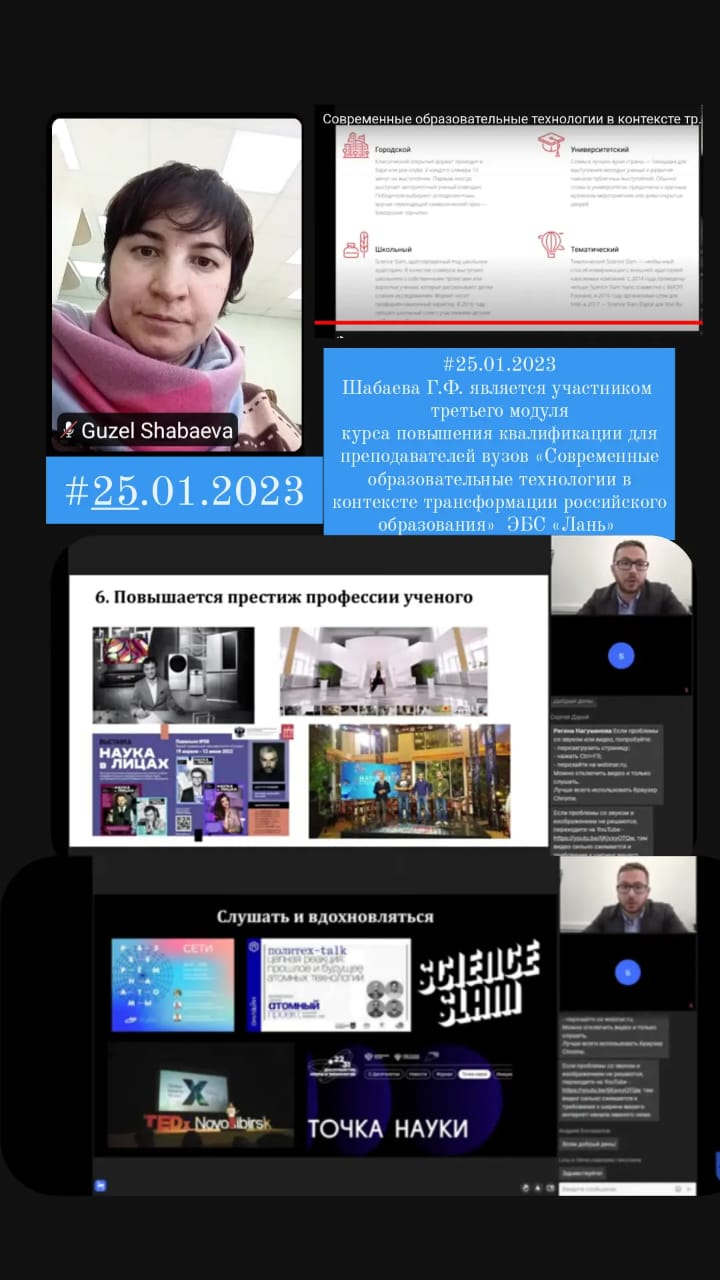 25.01.2022 г. Шабаева Г.Ф. является участником третьего модуля курса повышения квалификации для преподавателей вузов «Современные образовательные технологии в контексте трансформации российского образования» электронного ресурса Лань:  ЭБС «Лань» – электронно-библиотечная система, предоставляющая студентам, аспирантам и преподавателям разные возможности .