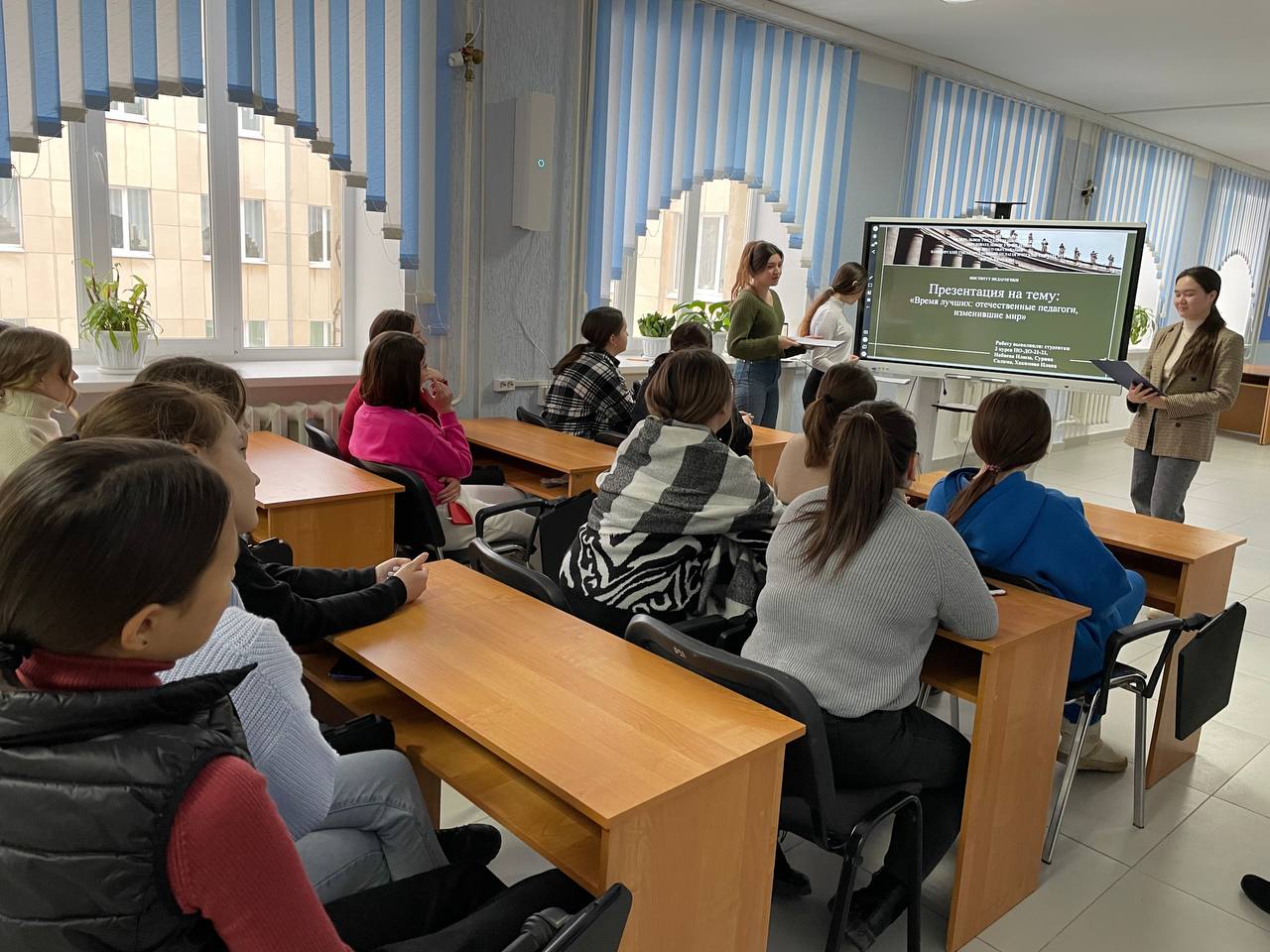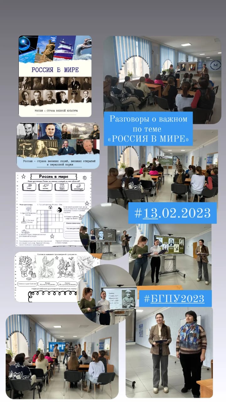 Набиева Илюза, Сурина Салима Научный руководитель: к.п.н., доц.  Сыртланова Н.Ш. 4 курс ПО_ДО: Шайгарданова Аида, Дмитриева Екатерина Научный руководитель: к.п.н., доц. Шабаева Г.Ф.  в интерактивной форме провели разговоры о важном по теме «РОССИЯ В МИРЕ» с  целью раскрыть  значение  и  роль России  в  современном  мире, формировать  представления  обучающихся  о  достижениях  и  мировой значимости  российской  науки,  культуры,  технологий, о вкладе Российских учёных. Формирующиеся ценности: патриотизм, любовь к Родине, служение Отечеству.