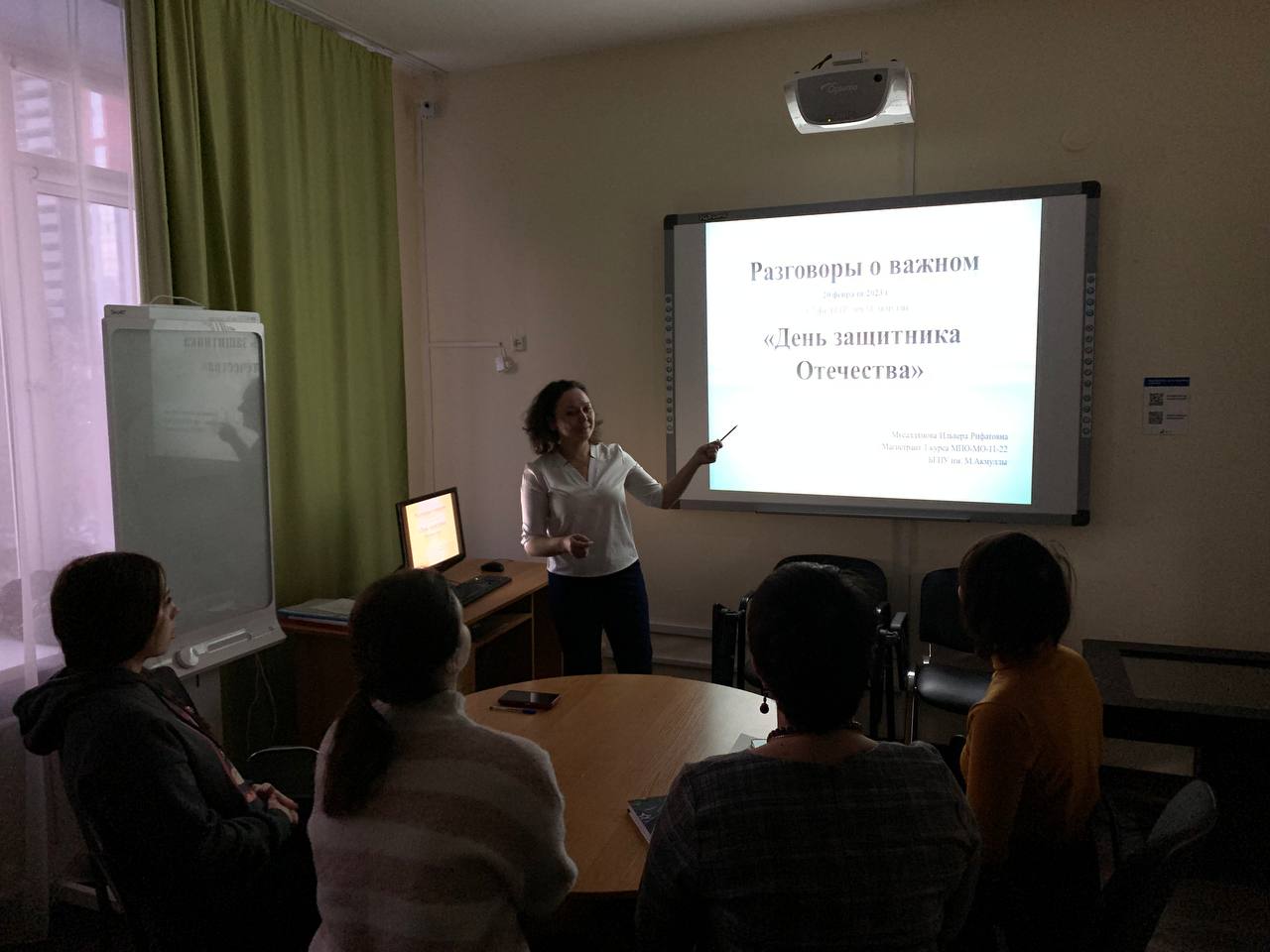 20.02.2023г. магистранты 1 курса группы МПОМО-11-22 Мусаллямова Ильвера Рифатовна, Гоголева Гульнара Магдановна  провели со студентами 2 курса ПО Баш.яз. дошкольное образование, 4 курс ПО- ДО мероприятие в рамках Всероссийского проекта "Разговоры о важном".
