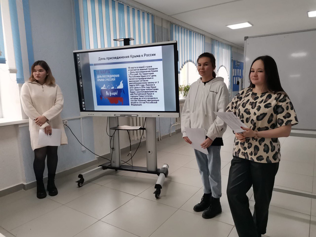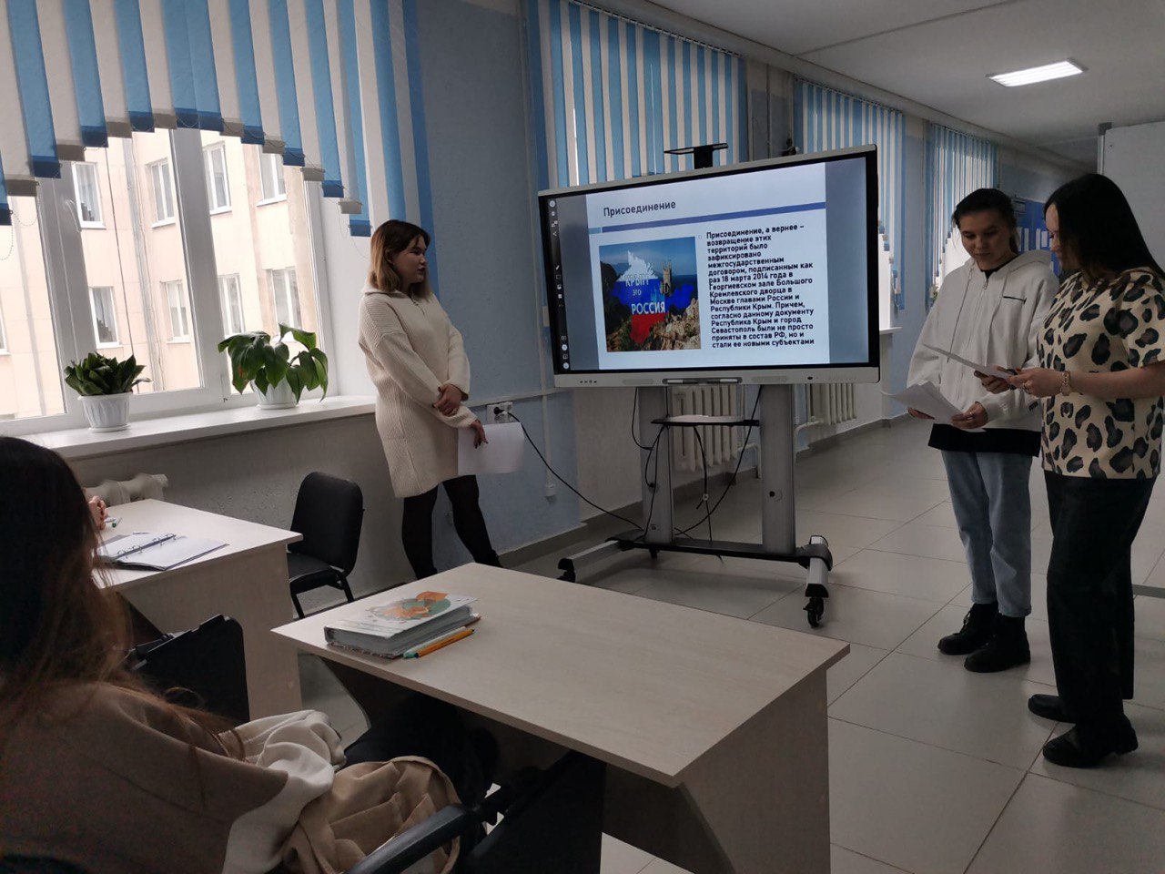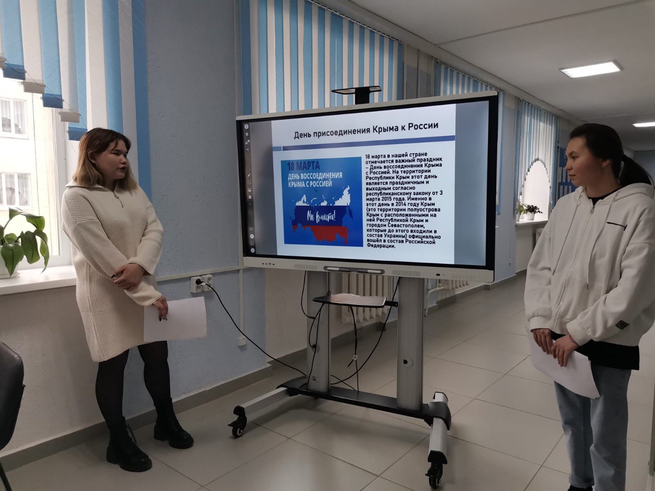 20 марта 2023 года студенты направления подготовки 44.03.01 Педагогическое образование, направленность (профиль) «Дошкольное образование» провели беседу на тему «День воссоединения Крыма с Россией», которое входит в цикл внеурочной деятельности в рамках проекта "Разговоры о важном" со студентами 1 и 2 курсов. Стало доброй традицией проводить такие беседы со всеми студентами очной формы обучения. Стоит отметить и самостоятельность, ответственность, инициативность в подборе и представлении материала.